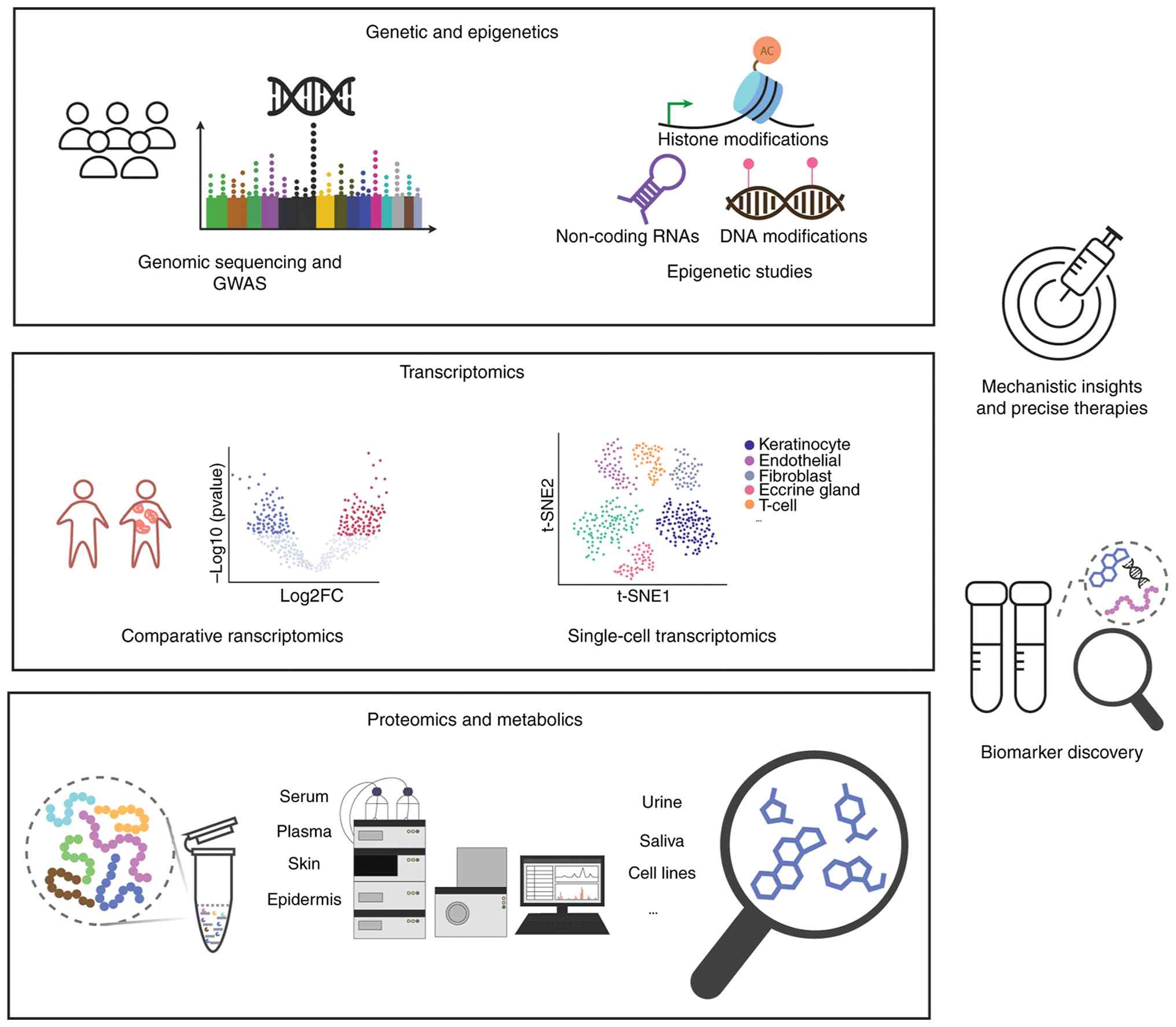 Traditionally regarded as an immune-mediated disease, psoriasis pathogenesis has been broadened by multi-omics investigations, extending beyond immune cell activation and keratinocyte proliferation, emphasizing the roles of complex immune signaling, transcriptional heterogeneity, dynamic proteomic changes, metabolic rewiring and host-microbiome interactions. These multi-layered insights not only enhance our understanding of disease mechanisms but also identify promising biomarkers and therapeutic targets (Fig. 2). In the future, integrating omics data across spatial, temporal and cellular dimensions will be crucial for advancing precision diagnostics and targeted therapies.