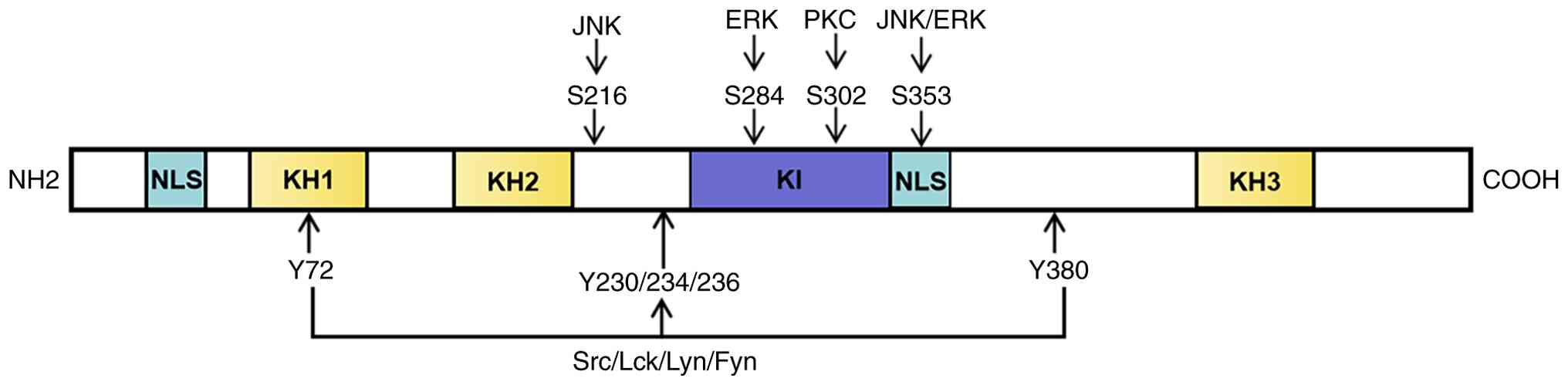 Through alternative cleavage, hnRNPK can freely move between the cytoplasm and nucleus to create five distinct cleaved entities, hnRNPK A-E. The majority of the hnRNPK protein comprises two bidirectional nuclear localization signals (NLS), three functional regions (KH domains) and one K protein interaction (KI) region (26). The KH region, a tertiary structure composed of three helices and three folds (βααββα), is involved in the binding of DNA or RNA, splicing of mRNA and control of transcription. The proline-rich KI region primarily serves as a binding site for sarcoma (Src) kinase family proteins. The mRNA export process is highly selective. The nucleus has a bilayer membrane structure and the only channel present is the nuclear pore complex (NPC). The export of mRNA molecules through the NPC requires energy and the formation of an mRNA-protein complex (23). After forming this complex with the precursor mRNA, hnRNPK transports it into the cytoplasm through the NPC. Together with additional proteins, such as RNA polymerase II, it undergoes splicing and modification before dissociating from the complex and returning to the nucleus to participate in the subsequent round of transport (27). The molecular structure of hnRNPK is illustrated in Fig. 1.