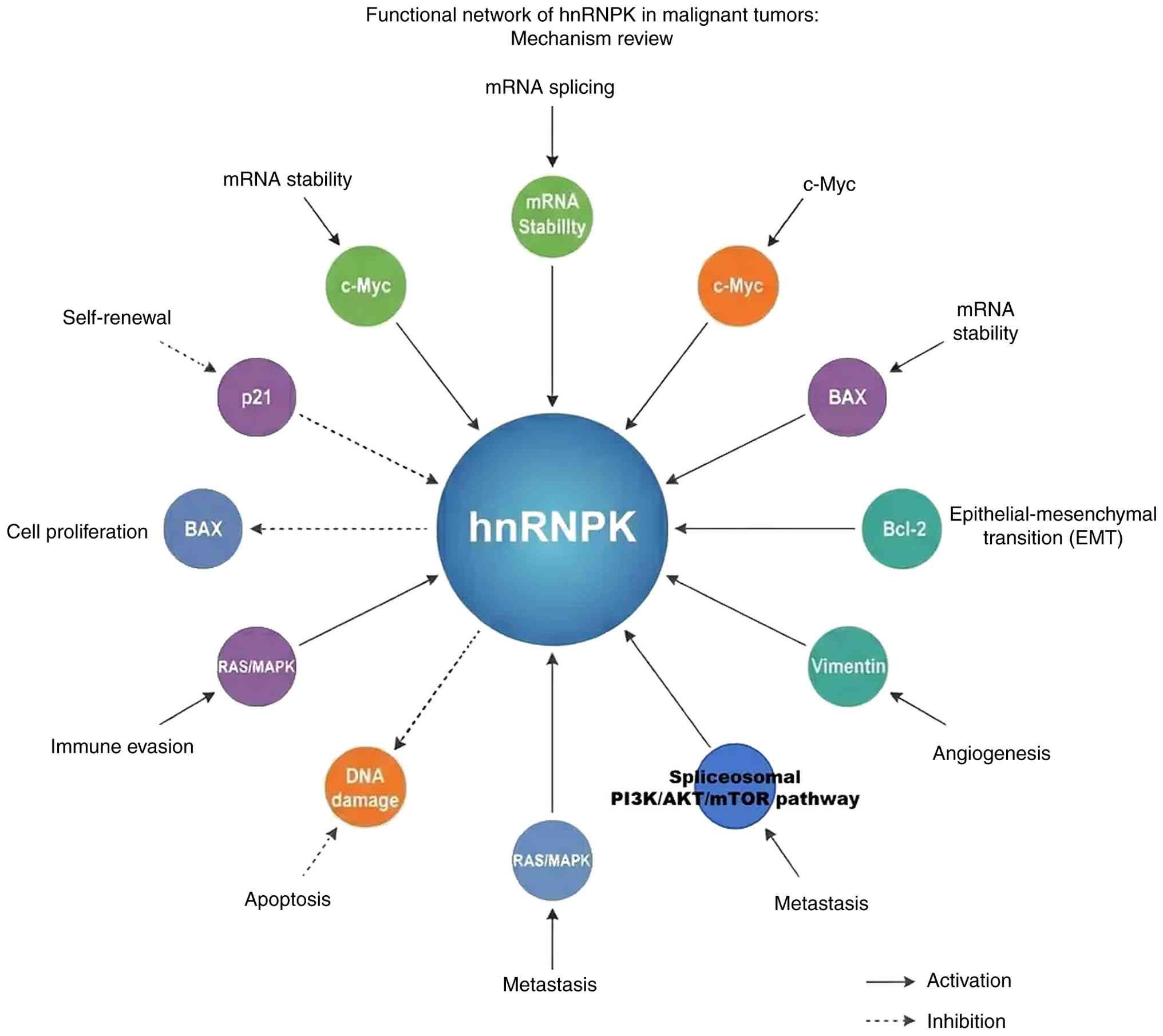 hnRNPK controls the expression of numerous oncogenes and tumor suppressor genes in malignancies, as well as the proliferation, apoptosis, migration and invasion of tumor cells. Fig. 2 presents a comprehensive overview of the hnRNPK functional network in malignant tumors, illustrating its multifaceted roles in cancer biology through a number of molecular mechanisms and signaling pathways.
