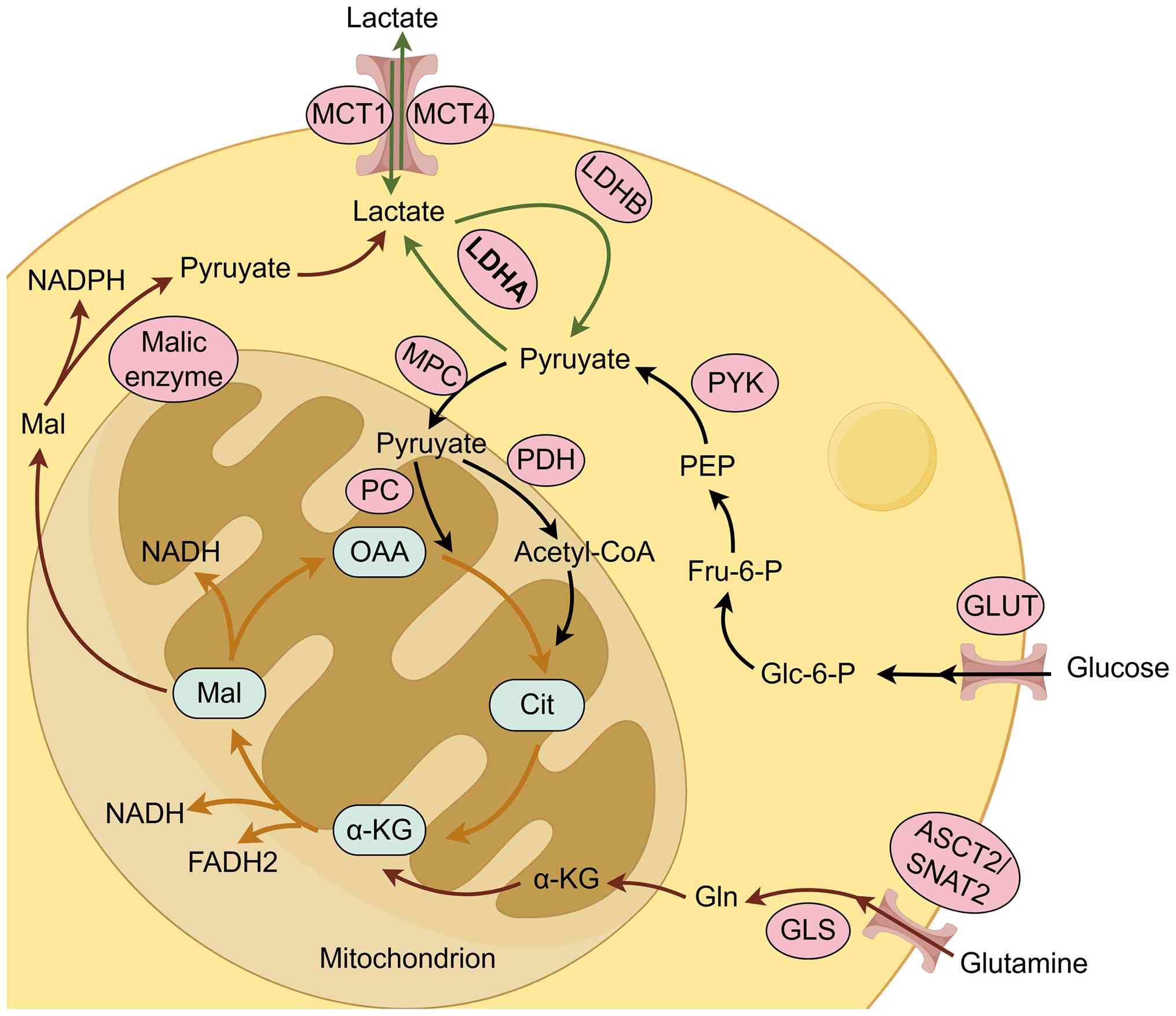 In both physiological and neoplastic contexts, glucose acts as the principal substrate for lactate generation, marking the end of the glycolytic cascade (Fig. 1) (22). Cellular uptake of glucose is predominantly mediated by glucose transporter (GLUT) proteins (23). Following internalization, glucose is metabolized to pyruvate under normoxic conditions. Subsequently, the bulk of this pyruvate enters the mitochondria via the mitochondrial pyruvate carrier, or is shuttled after conversion to undergo oxidative phosphorylation. Within the mitochondria, the tricarboxylic acid (TCA) cycle and electron transport chain drive the synthesis of ATP, releasing CO2 and H2O as byproducts (24) Conversely, in hypoxic or anaerobic environments, oxidative phosphorylation is compromised. To maintain redox homeostasis and sustain glycolysis, cytosolic pyruvate is reduced to lactate by lactate dehydrogenase (LDH) (25) Structurally, LDH exists as a tetramer formed by varying combinations of muscle subunits (M) and heart subunits (H), yielding five distinct isozymes: LDH-1 (4H), LDH-2 (3H1M), LDH-3 (2H2M), LDH-4 (1H3M) and LDH-5 (4M) (26). While these isoforms are bidirectional, LDHA (LDH-5) preferentially drives the reduction of pyruvate to lactate, thereby markedly fueling tumor progression, whereas LDHB (LDH-1) favors the oxidation of lactate back to pyruvate (27,28). Beyond glucose, research has highlighted glutaminolysis as an alternative metabolic route in cancer cells (29). Driven by the c-Myc proto-oncogene, glutamine enters the cytoplasm via specific transporters, including ASCT2 and SNAT2 (30). Once inside the cell, glutaminase (GLS) converts glutamine into glutamate, which is further processed into α-ketoglutarate by enzymes such as glutamate dehydrogenase to enter the TCA. Carbon derived from glutamine is then metabolized into oxaloacetate and subsequently malate, which is exported from the mitochondria. In the cytosol, malic enzyme converts malate to pyruvate, generating NADPH in the process, which is ultimately reduced to lactate by LDHA. Although this pathway typically serves as a secondary source of lactate, glutamine becomes the dominant carbon reservoir supporting cancer cell metabolism during glucose starvation (31). Furthermore, evidence suggests that under such glucose-deprived conditions, lactate enhances cell survival primarily by sustaining mitochondrial respiration through GLS1-mediated glutaminolysis (32).