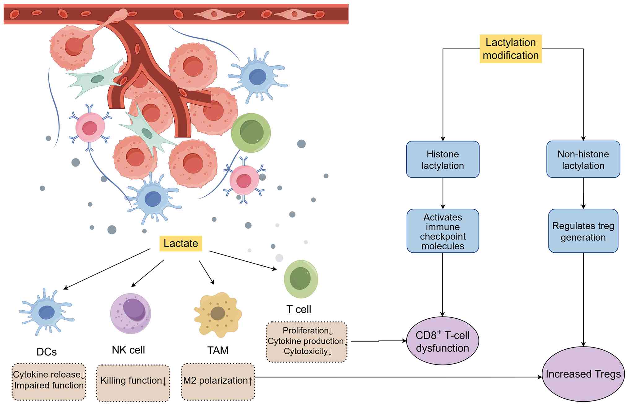Lactate has long been regarded as the end product of glycolysis, but it is now recognized as a multifunctional signaling molecule that serves a central role in promoting tumor cell metabolism and immune evasion. Lactylation, a recently discovered PTM, directly affects the functions of both histones and non-histones, linking metabolic reprogramming to epigenetic regulation. Moreover, lactylation modifications, by modulating cellular metabolic pathways, markedly influence tumor progression, immune suppression and mechanisms of drug resistance across various cancer types. In tumor immunology, lactylation influences the polarization and function of immune cells, including T cells and macrophages, thereby suppressing antitumor immune responses and promoting tumor resistance and recurrence. In the future, in-depth investigation of the mechanisms underlying lactylation, identification of its regulatory factors and the development of targeted therapeutics may provide novel directions and strategies for cancer treatment. By combining metabolic inhibitors with immunotherapy, it is anticipated that the efficacy of cancer treatment can be enhanced and resistance to current therapies can be overcome. These studies will help elucidate the complex role of lactylation modifications in tumorigenesis and drive the development of innovative therapeutic approaches.