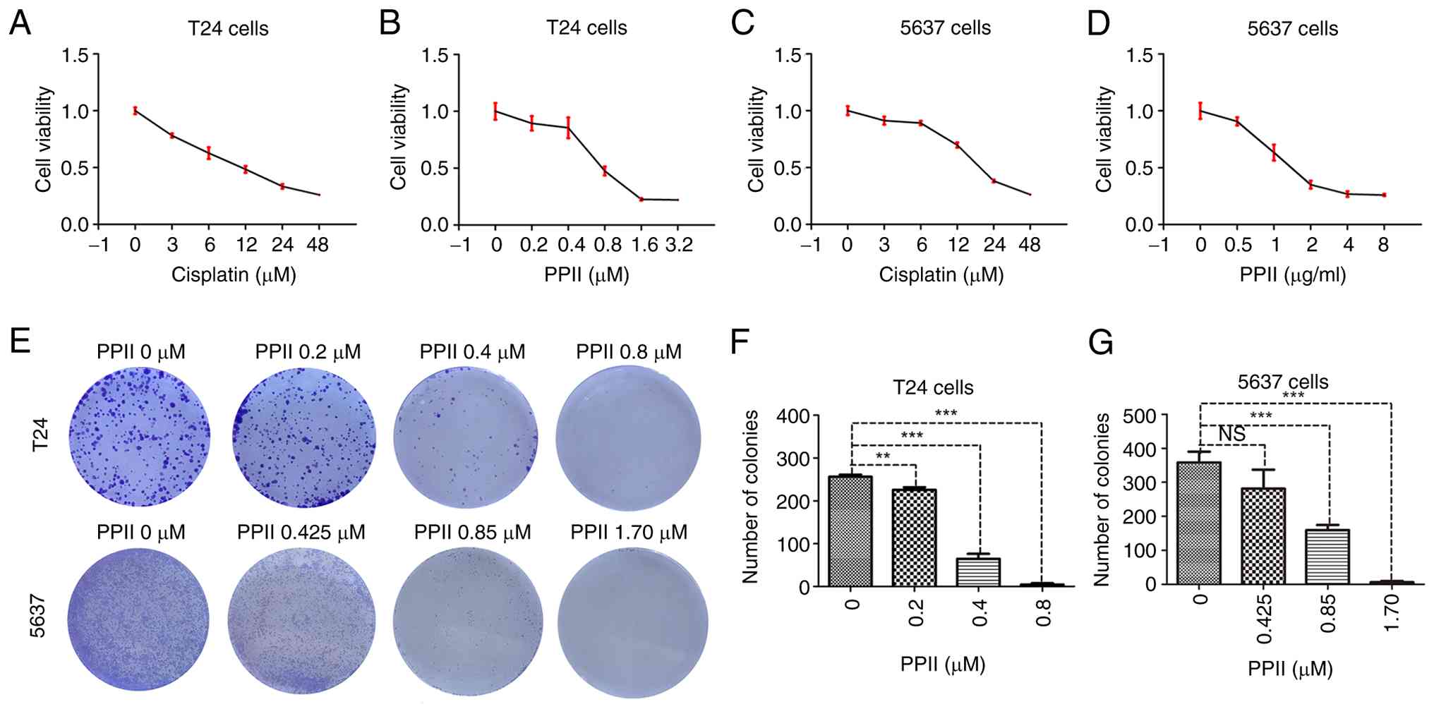 Cell viability was assessed using a CCK-8 assay kit (E-CK-A362, Elabscience Bionovation Inc.). T24 (3×103) and 5637 (6×103) cells were seeded into 96-well plates and incubated at 37°C with 5% CO2 overnight, after which the cells were treated with cisplatin or PPII. Following treatment, 10% CCK-8 solution was added to each well and gently mixed, and the plates were then incubated for an additional 2 h. The absorbance was measured at 450 nm using a spectrophotometer (Type 1510; Thermo Fisher Scientific, Inc.).