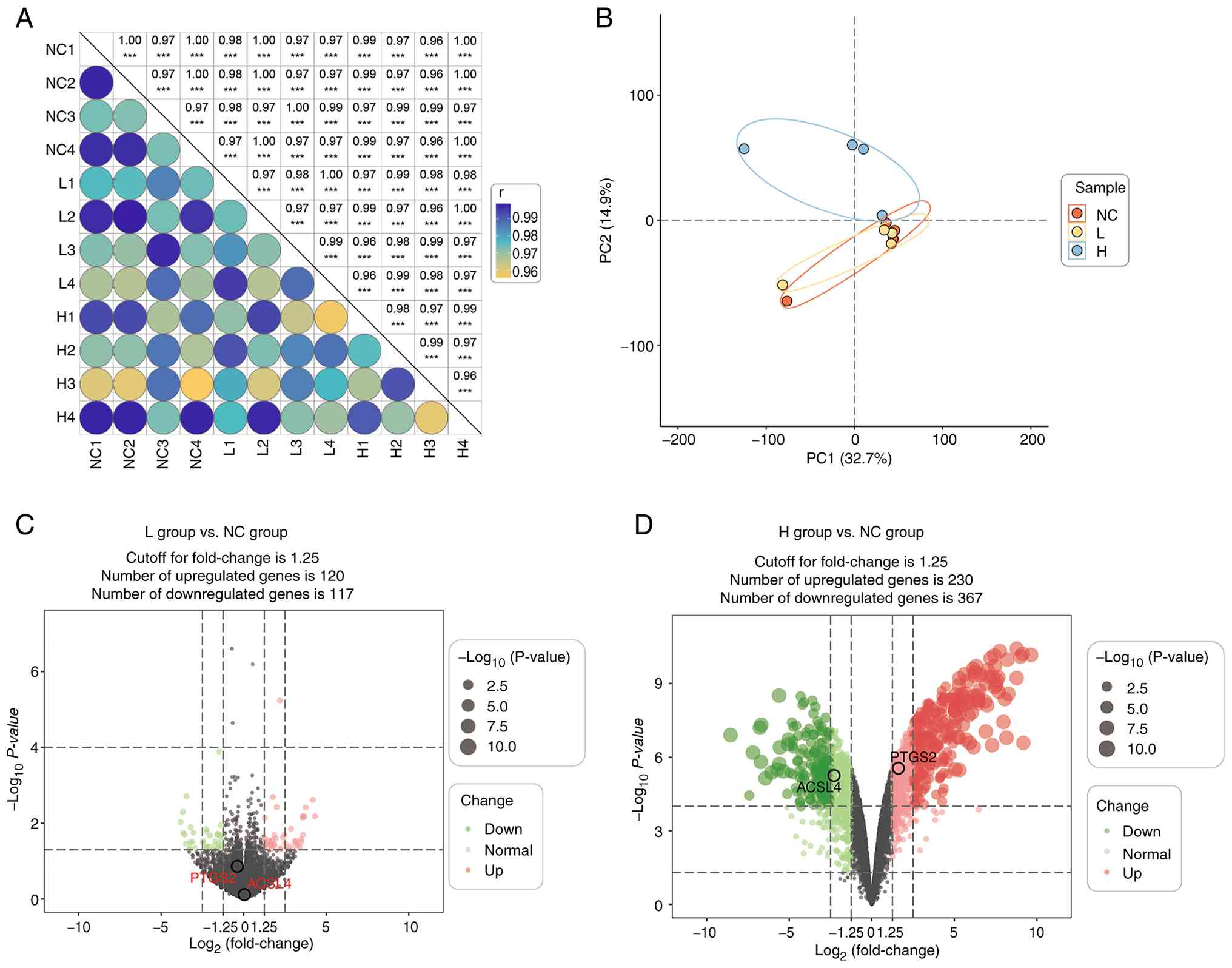 T24 cells were treated with high-concentration and low-concentration PPII for 48 h, after which the RNA was harvested in quadruplicate. A total of 12 samples were divided into three groups, namely, the NC, L and H groups, according to the concentrations of PPII (Fig. 2A). DEGs between each group were identified using a P-value <0.05 and a fold change greater than the cutoff. A total of 834 DEGs were identified between the NC, L and H groups. Principal components analysis revealed that the between-group samples were clearly separated from each other and revealed good clustering of samples within the same group, indicating distinct gene expression profiles upon PPII treatment (Fig. 2B). Volcano plots also revealed the DEGs that differed from each other in the groups (Fig. 2C and D). All the DEGs were included in the subsequent analyses.