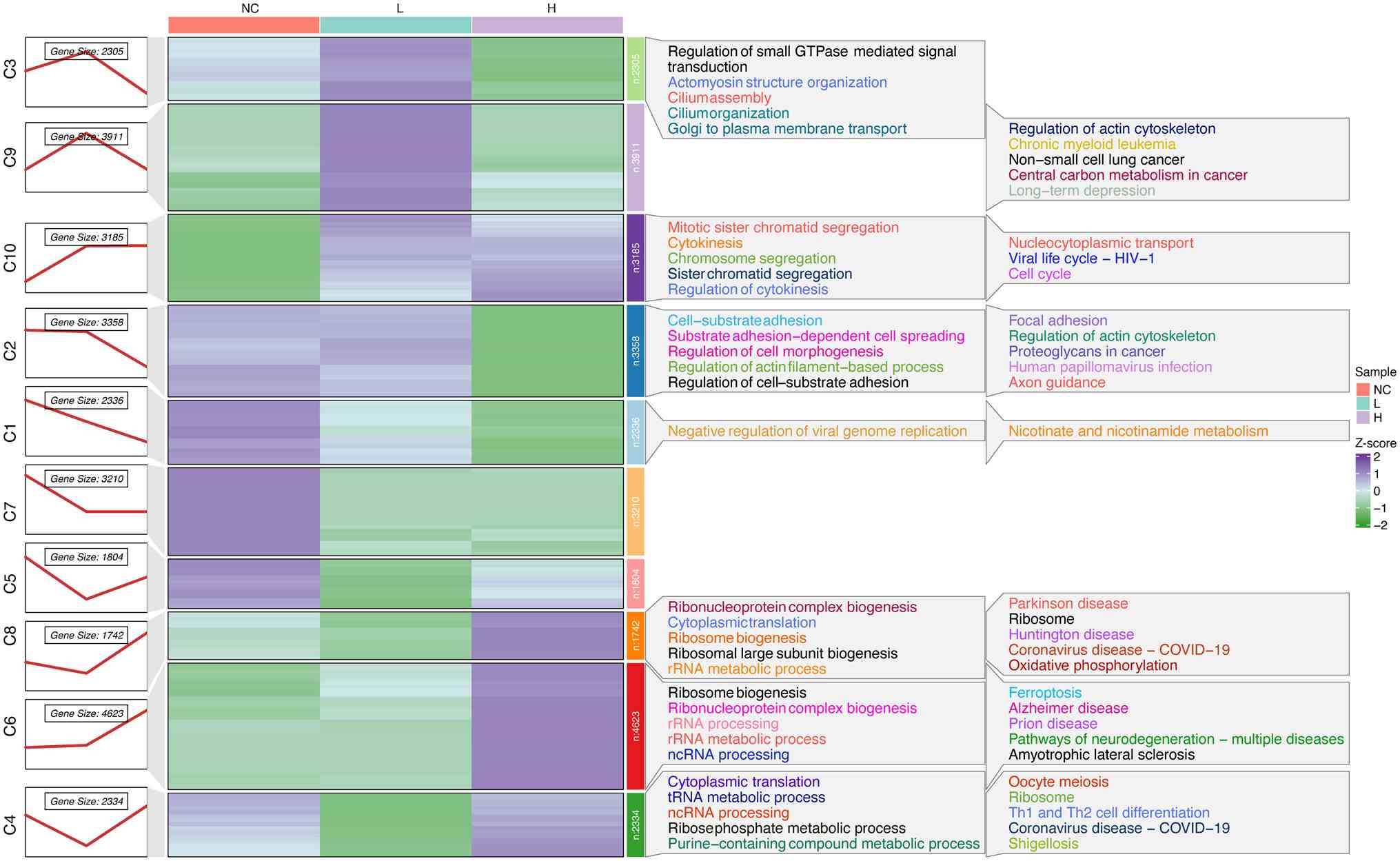To understand the dynamic alteration expression profiles in T24 cells during the progression of PPII treatment, 834 DEGs were subjected to soft clustering to determine their expression trends in the three series groups. The DEGs were divided into 10 clusters according to their trend similarity over time using a soft Mfuzz clustering algorithm and not all the clusters exhibited consistent expression trends with a distinct peak. A heatmap revealed that both Cluster 6 and Cluster 8 showed transcriptional upregulation response to PPII treatment, Cluster 6 demonstrated a more consistent concentration-dependent pattern, showing gradual upregulation with increasing PPII concentrations. By contrast, Cluster 8 exhibited a biphasic response with initial downregulation at lower concentrations followed by upregulation at higher doses (Fig. 3). On the basis of this clear concentration-dependent response, Cluster 6 was selected for further investigation.