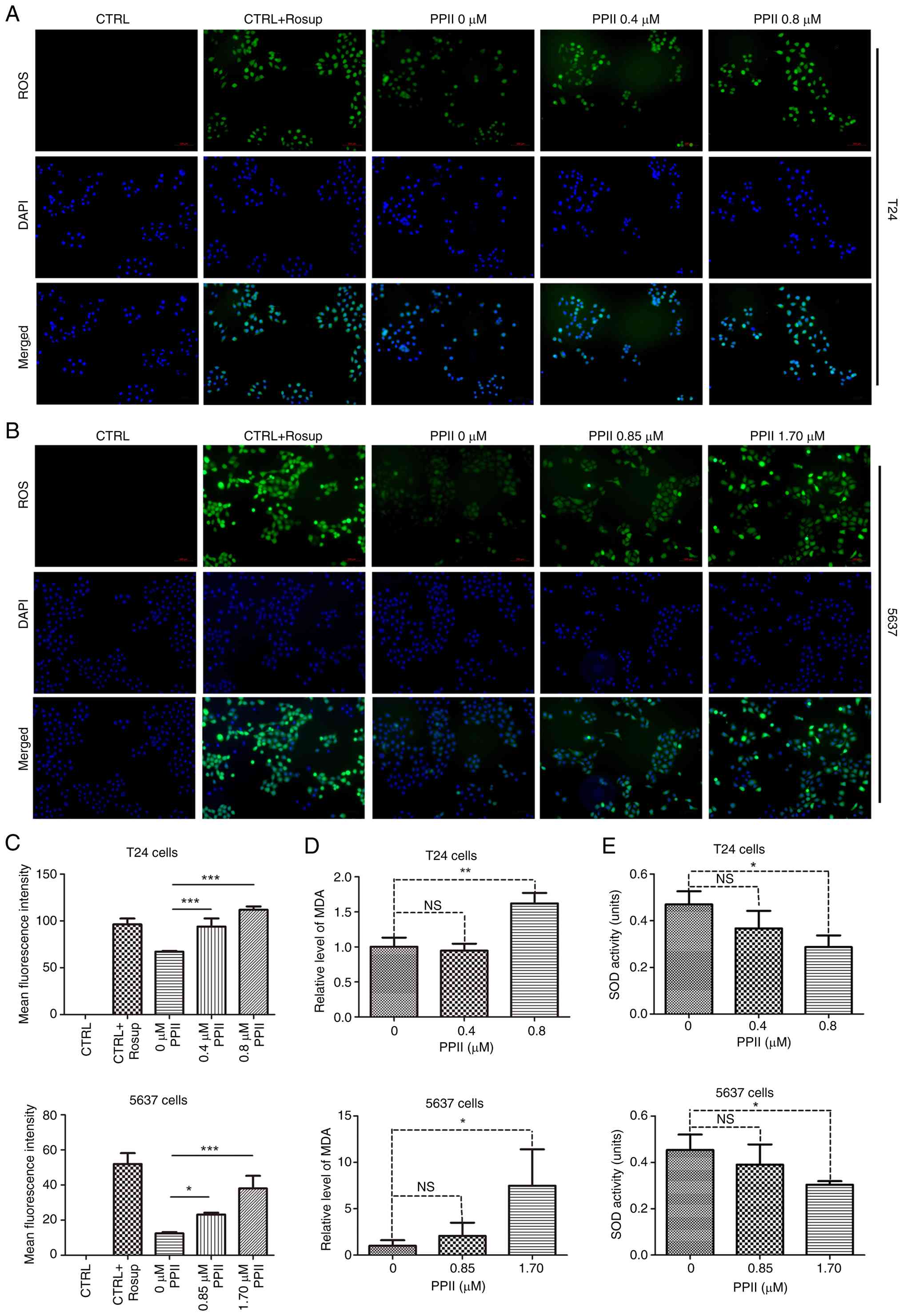 The effect of PPII on ROS levels in bladder cancer cells was assessed using a ROS detection kit, as detailed in the methods section. The fluorescence intensity was used to quantify the ROS levels, revealing that T24 cells exhibited a significant increase in fluorescence intensity following PPII treatment. Notably, the fluorescence intensity in the 0.8 µM PPII treatment group was comparable to that in the positive control group (CRTL + Rosup; Fig. 5A). Statistical analysis demonstrated that as the concentration of PPII increased, the average fluorescence intensity significantly increased (Fig. 5C; P<0.001) in a dose-dependent manner. Similar results were observed in 5637 cells (Fig. 5B and C). Since MDA and SOD are critical regulators of ROS levels, their concentrations were measured. High concentrations of PPII (0.8 µM for T24 cells and 1.70 µM for 5637 cells) significantly increased MDA levels (Fig. 5D, P<0.05) but inhibited SOD activity (Fig. 5E; P<0.05). Furthermore, Pearson analysis revealed a negative correlation between ROS and SOD, whereas ROS and MDA showed a positive correlation (Fig. S1B). These findings suggested that PPII effectively increases ROS levels in bladder cancer cells.