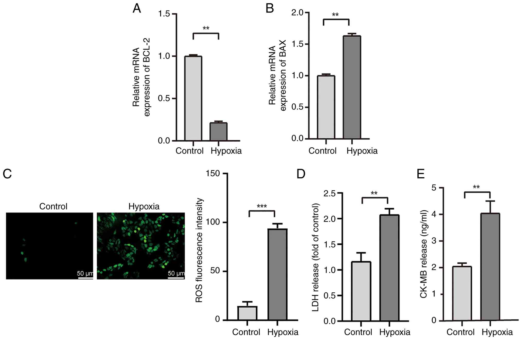 To assess the effects of hypoxia on apoptosis and cellular damage, a hypoxia-induced cardiomyocyte model was established. AC16 cardiomyocytes, exposed to hypoxia for 24 h, exhibited significant downregulation of BCL-2 mRNA expression and upregulation of BAX mRNA expression. The results indicated that prolonged hypoxia activated apoptotic pathways (Fig. 1A and B).