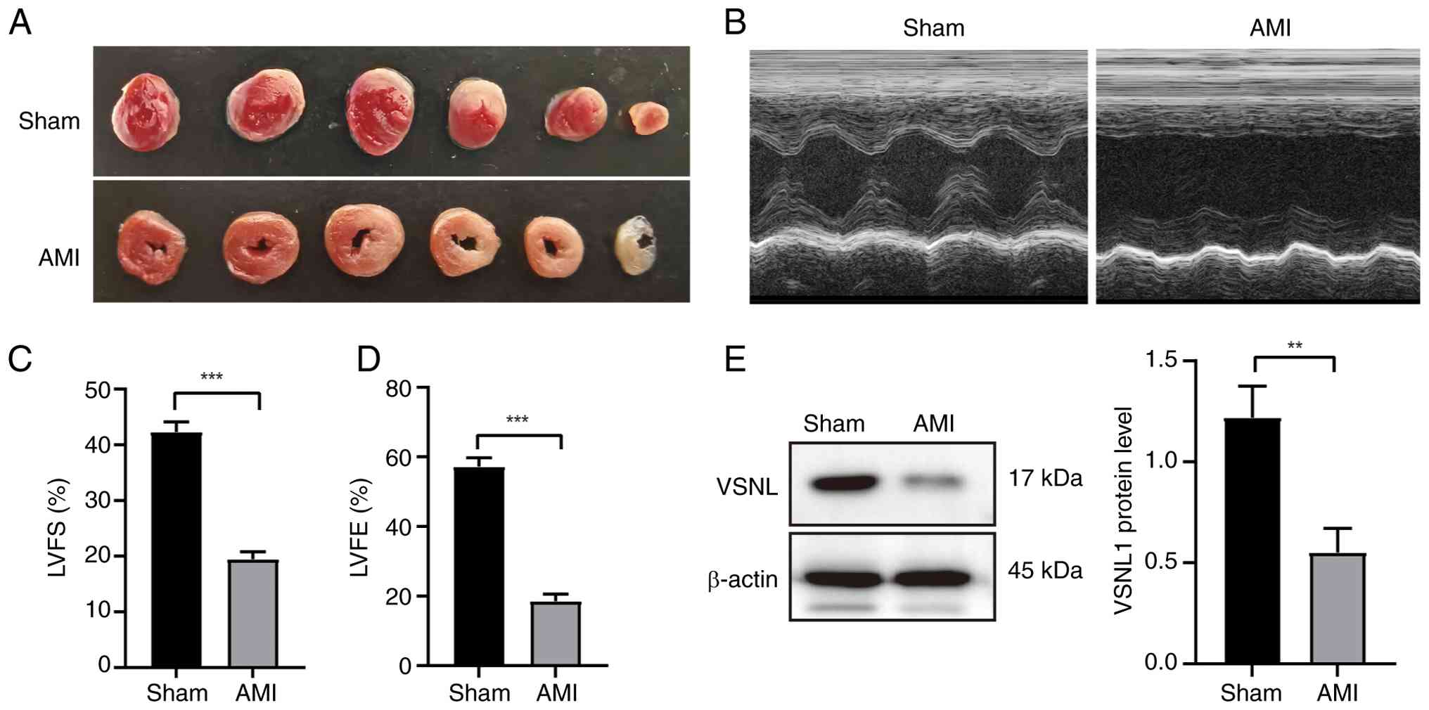 To further assess whether the aforementioned regulation also occurs in vivo, an AMI model was established in mice via permanent ligation of the LAD coronary artery. Mice were randomly assigned to an AMI group or a sham-operated control group. Successful induction of infarction was confirmed by TTC staining, which showed pale infarcted regions in AMI mice and red-stained viable myocardium in sham controls (Fig. 3A). Echocardiographic assessment revealed significant reductions in the left ventricular ejection fraction and fractional shortening in AMI mice compared with the sham group (Fig. 3B-D), indicating impaired cardiac function. Consistent with the in vitro findings, western blot analysis demonstrated that VSNL1 expression was markedly decreased in the myocardial tissue of AMI mice (Fig. 3E), supporting its potential role in the pathogenesis of ischemic heart injury.