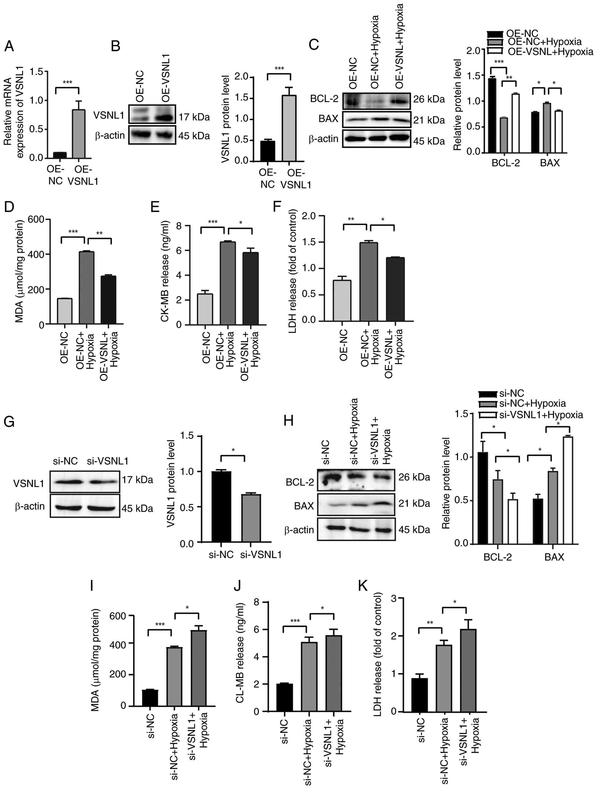 To further evaluate whether VSNL1 modulates cardiomyocyte injury related to apoptosis, intracellular levels of MDA, CK-MB and LDH were measured. The results revealed that VSNL1 overexpression markedly reduced the release of these markers (Fig. 4D-F), whereas VSNL1 silencing exacerbated hypoxia-induced cardiomyocyte damage, demonstrated by markedly elevated levels of MDA, CK-MB and LDH (Fig. 4I-K).