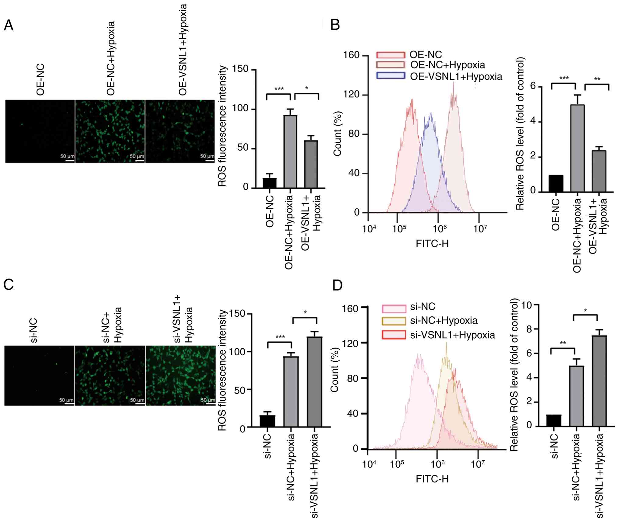 Hypoxia-induced cellular damage is closely associated with elevated ROS levels, a hallmark of oxidative stress (18). ROS serve as key mediators of mitochondria-mediated apoptosis (19,20), characterized by excessive ROS production and loss of MMP (21). To evaluate the role of VSNL1 in alleviating intracellular oxidative stress, ROS accumulation was quantified and visualized using fluorescence microscopy and flow cytometry. The results revealed that the hypoxia-treated cells exhibited a significant increase in green fluorescence intensity (Fig. 5A and B), indicative of excessive ROS accumulation. Notably, overexpression of VSNL1 markedly reduced ROS levels compared with those in the hypoxia group. Conversely, silencing of VSNL1 using siRNA exacerbated oxidative stress, as demonstrated by the increase in ROS levels (Fig. 5C and D). These findings highlighted the role of VSNL1 in alleviating hypoxia-induced oxidative stress during the early phase of myocardial apoptosis.
