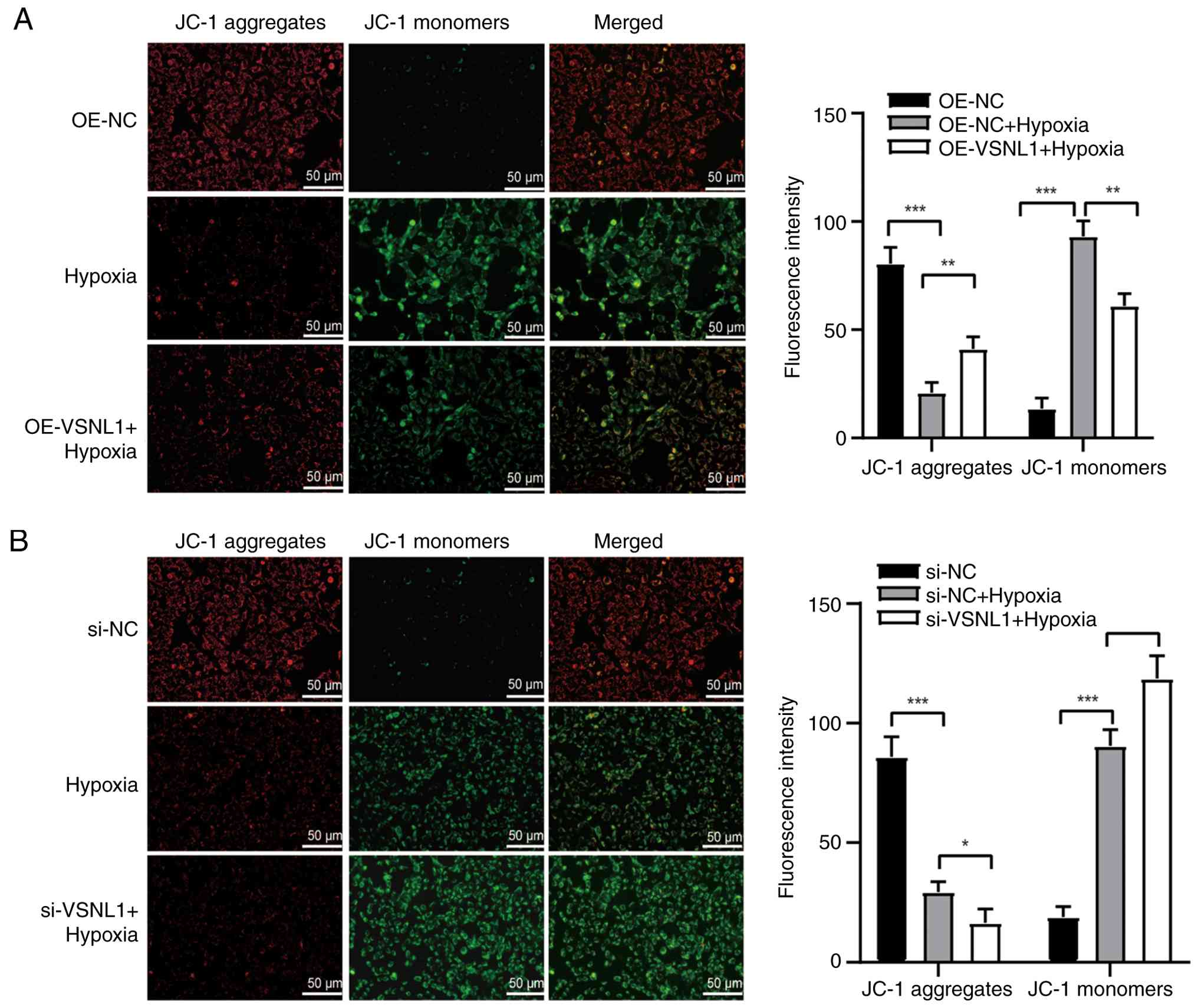 The loss of MMP is a pivotal event that increases mitochondrial outer membrane permeability, representing an early step in the intrinsic apoptotic pathway (22). To evaluate whether VSNL1 influences mitochondrial depolarization, the MMP was measured using JC-1 dye, which detects changes in the MMP via fluorescence shifts. Under hypoxic conditions, a marked increase in JC-1 monomers emitting green fluorescence was observed, along with a near absence of JC-1 aggregates emitting red fluorescence, indicating a substantial loss of MMP. Overexpression of VSNL1 markedly mitigated this effect, reducing green fluorescence and partially restoring red fluorescence, suggesting that VSNL1 overexpression alleviated the loss of MMP (Fig. 6A). By contrast, cells treated with si-VSNL1 under hypoxic conditions exhibited decreased red fluorescence and increased green fluorescence compared with the hypoxia-only group, confirming a pronounced reduction in MMP (Fig. 6B). These findings underscored the essential role of VSNL1 in maintaining the MMP and mitochondrial function, as well as its regulatory effect in attenuating hypoxia-induced myocardial apoptosis.