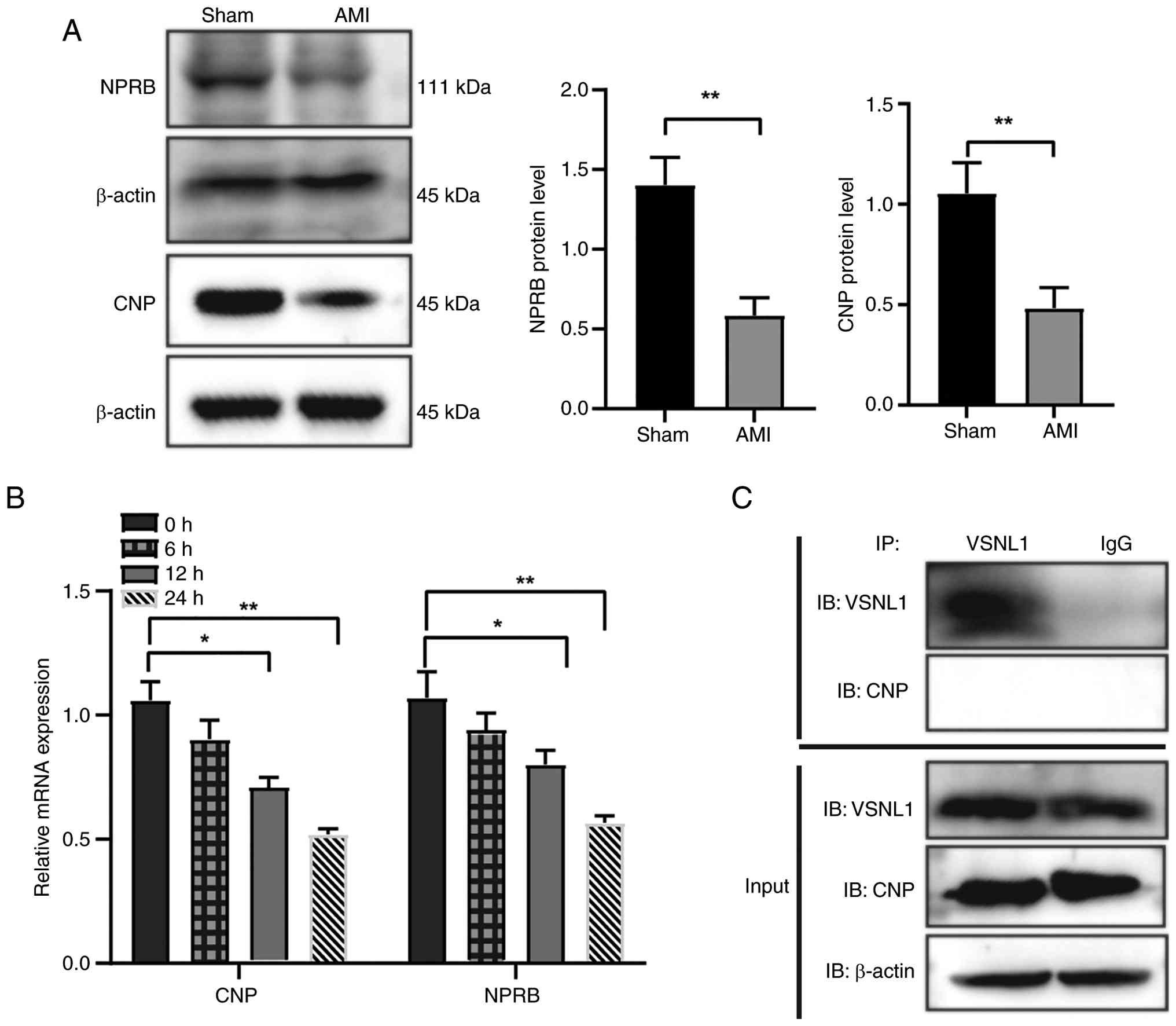 To determine whether VSNL1 regulates this pathway via direct protein-protein interaction, a Co-IP assay was performed in AC16 cells. Experimental groups included the VSNL1-IP group, IgG control group and total protein (Input) group. Immunoblotting was performed using anti-VSNL1 and anti-CNP antibodies, and the results revealed that both VSNL1 and CNP proteins were markedly expressed in the Input group, indicating sufficient protein extraction. In the VSNL1-IP group, VSNL1 was successfully precipitated using the anti-VSNL1 antibodies, confirming the validity of the Co-IP system. By contrast, no CNP band was detected in the VSNL1 immunoprecipitated complex, indicating that VSNL1 does not form a stable, direct protein-protein complex with CNP under the experimental conditions used. Additionally, no specific bands were observed in the IgG control group, excluding the possibility of nonspecific binding (Fig. 7C).
