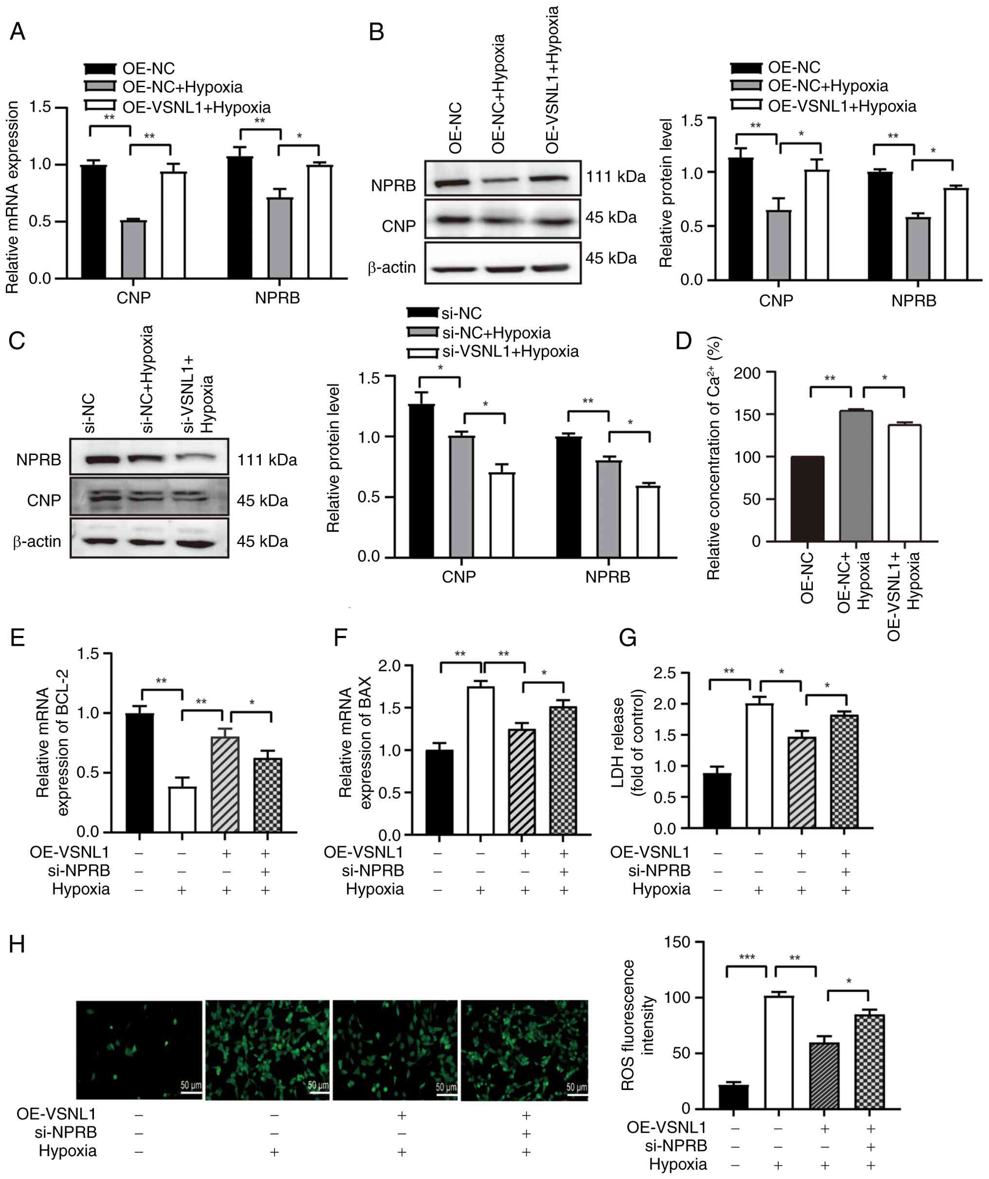 The CNP/NPRB signaling pathway is known for its protective anti-inflammatory and anti-apoptotic effects, particularly in cardiac ischemia-reperfusion injury (23,24). To assess whether VSNL1 regulates apoptosis through this pathway, the present study evaluated its effect on CNP and NPRB expression. The results demonstrated that hypoxia markedly downregulated CNP and NPRB mRNA and protein levels, whereas VSNL1 overexpression restored their expression (Fig. 8A and B). Conversely, VSNL1 knockdown exacerbated their downregulation (Fig. 8C). Hypoxia-induced Ca2+ overload is closely associated with cardiomyocyte damage and dysfunction (25). Given the role of VSNL1 in calcium signaling, it was hypothesized that it maintains calcium homeostasis via the CNP/NPRB pathway, which regulates cGMP levels and calcium dynamics critical for myocardial function (26). Supporting this, the findings of the present study demonstrated that VSNL1 overexpression markedly reduced intracellular Ca2+ levels in hypoxia-exposed AC16 cells (Fig. 8D).
