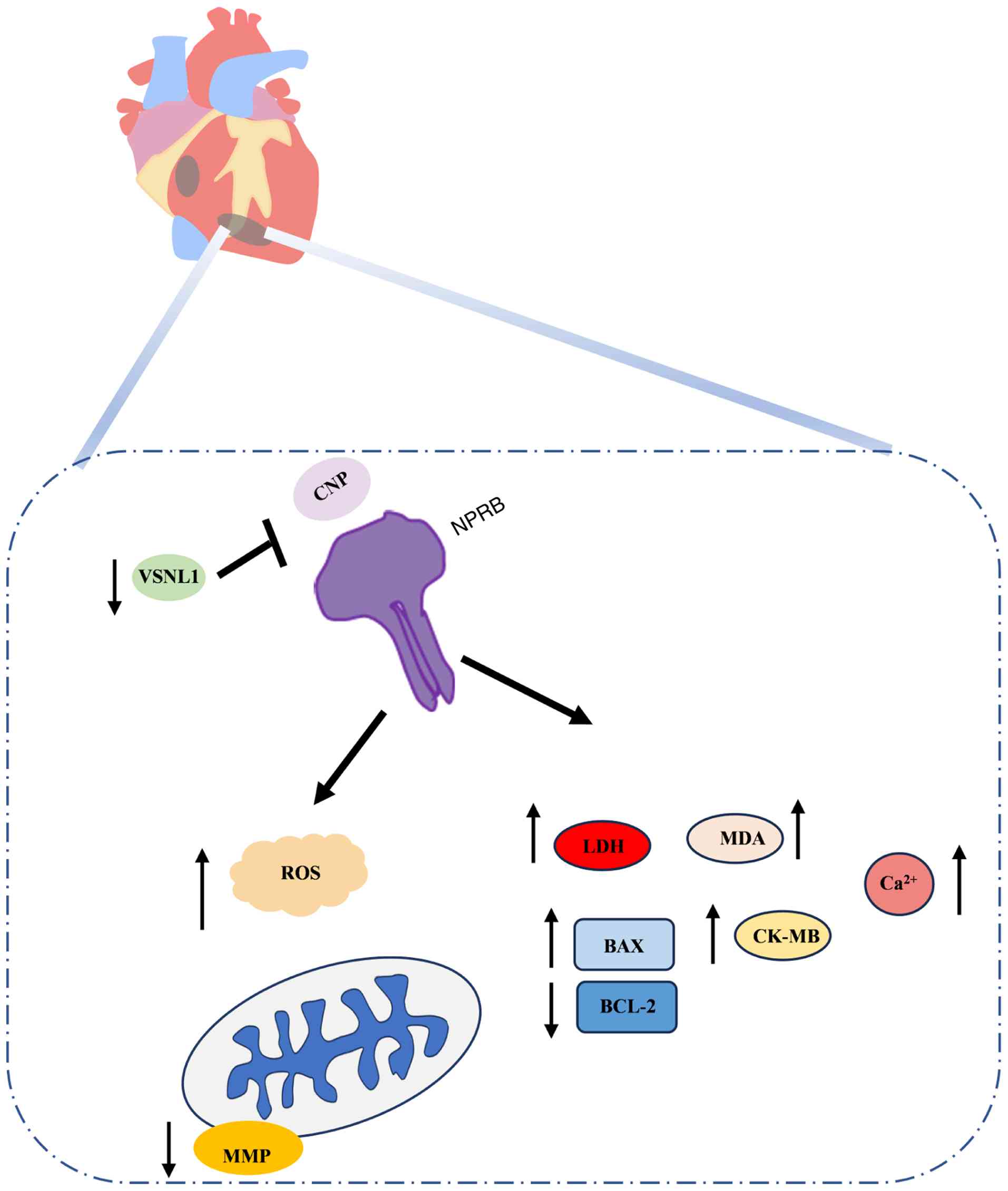 While the current study primarily focused on the upstream regulation and anti-apoptotic effects of VSNL1 via the CNP/NPRB axis, elucidating the downstream signaling events is essential to comprehensively understand the mechanism. As a future research direction, it is intended to investigate the activation status of PKG and the expression or modulation of calcium-handling proteins in response to VSNL1 regulation, using both molecular and functional assays. These future studies will aim to clarify whether the CNP/NPRB-mediated cardioprotection involves cGMP signaling and calcium homeostasis pathways.