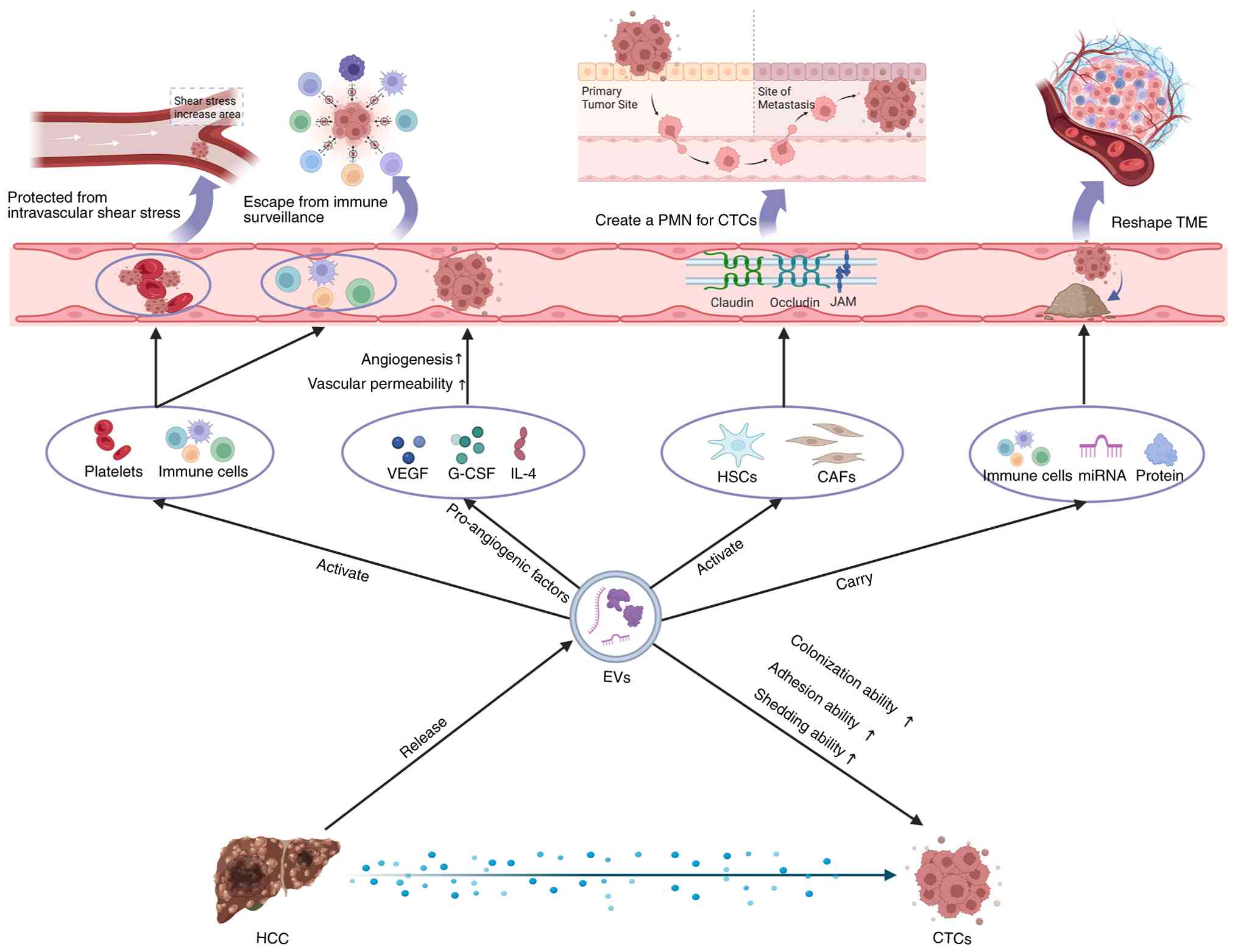 At the onset of metastasis, EVs enhance CTC shedding by promoting EMT and ECM remodeling, stimulating angiogenesis, increasing vascular permeability and strengthening the adhesion ability of CTCs. In advanced HCC, target organ metastasis is common, with EMT activation playing a marked role in initiating metastasis (88). Studies have demonstrated that EVs are pivotal in the metastatic process of HCC, inducing EMT activation and weakening the adhesion of tumor cells, thus facilitating the shedding of tumor cells to form CTCs (89). EVs regulate key genes (for example, PRDM16 and LHX6) in the EMT pathway, activating the Wnt/β-catenin, Notch and MAPK/ERK signaling pathways, among others, to promote the detachment of CTCs from the primary tumor site and enhance their shedding. Chen et al (90) observed that HCC cells treated with EVs showed elevated expression of α-SMA and vimentin, along with reduced expression of E-cadherin, promoting mesenchymal marker expression. Western blot analysis confirmed that these processes were mediated through the MAPK/ERK pathway, facilitating tumor cell migration, chemotaxis and invasion. Further research has revealed that EVs derived from hepatic stellate cells (HSCs) activate the Notch signaling pathway in HCC cells via PRDM16, leading to increased proliferation, migration, invasion and EMT progression (91). Hypoxia-induced EVs in HCC activate EMT through the Wnt/β-catenin signaling pathway, promoting HCC cell proliferation, migration and invasion (92). Moreover, tumor-derived EVs can directly or indirectly promote angiogenesis and increase vascular permeability by releasing pro-angiogenic factors (for example, VEGF and IL-8), which play a pivotal role in the formation of shed CTCs at the primary tumor site (93). Hypoxic HCC cell-derived EVs co-cultured with M2 macrophages secrete higher levels of VEGF, granulocyte colony-stimulating factor and IL-4, which further stimulate angiogenesis and increase vascular permeability, enabling tumor cells to shed into circulation as CTCs, thereby enhancing metastasis (94). Disruption of vascular barriers is a pivotal step in CTC-mediated HCC metastasis, requiring the breakdown of tight junctions and the integrity of vascular endothelial cells (95). Tumor-derived EVs enhance vascular permeability and promote CTC production and shedding by transferring their contents to endothelial cells. The protein nidogen 1, secreted by HCC-derived EVs, increases the permeability of lung endothelial cells by disrupting the integrity of the endothelial barrier and promoting angiogenesis, raises tumor necrosis factor receptor 1 expression and facilitates the formation of the PMN in the lungs (96).