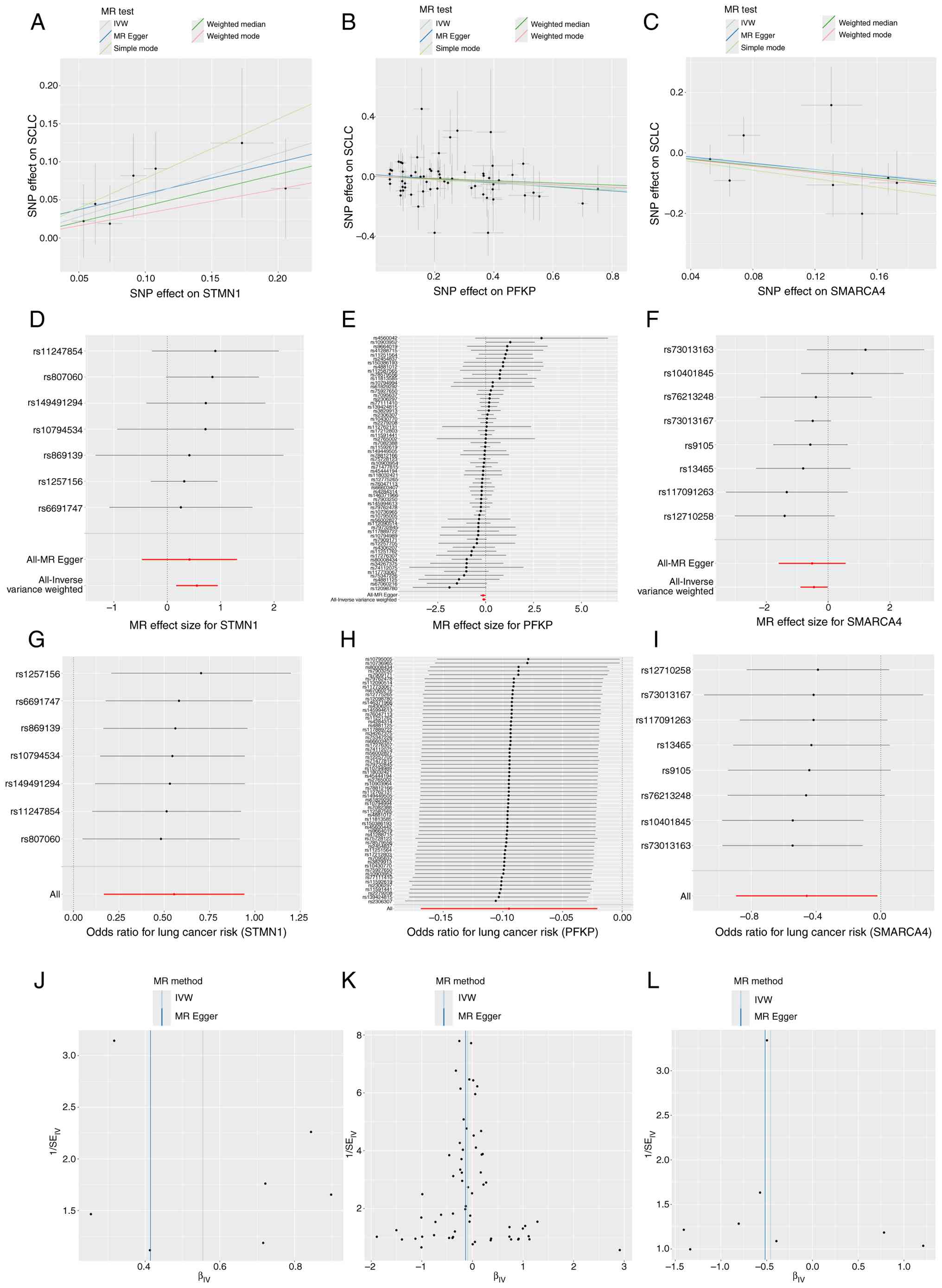 A total of three genes with valid MR results underwent multiple testing correction. STMN1 was the only gene significantly associated with lung cancer risk in both correction methods. PFKP and SMARCA4 were only significant after FDR correction, but not after Bonferroni correction (Table IV).