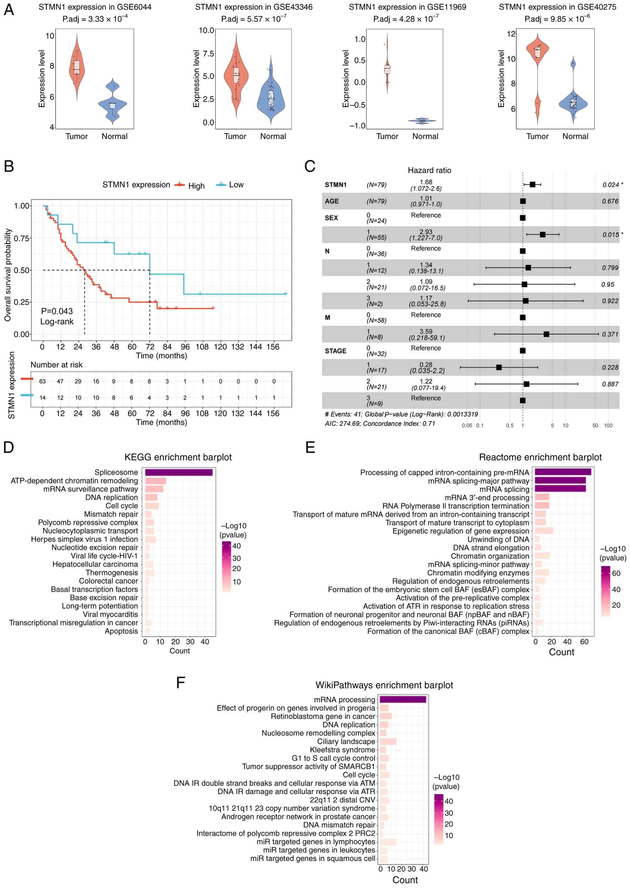 Functional enrichment analyses were performed to investigate the biological roles of STMN1. KEGG pathway enrichment analysis (Fig. 2D) demonstrated significant enrichment in pathways, including ‘spliceosome’ and ‘ATP-dependent chromatin remodeling’. Reactome enrichment analysis (Fig. 2E) highlighted its enrichment in processes, including ‘processing of capped intron-containing pre-mRNA’, ‘mRNA splicing major pathway’ and ‘mRNA splicing’. WikiPathways enrichment analysis (Fig. 2F) revealed its role in the ‘mRNA processing’ pathway.