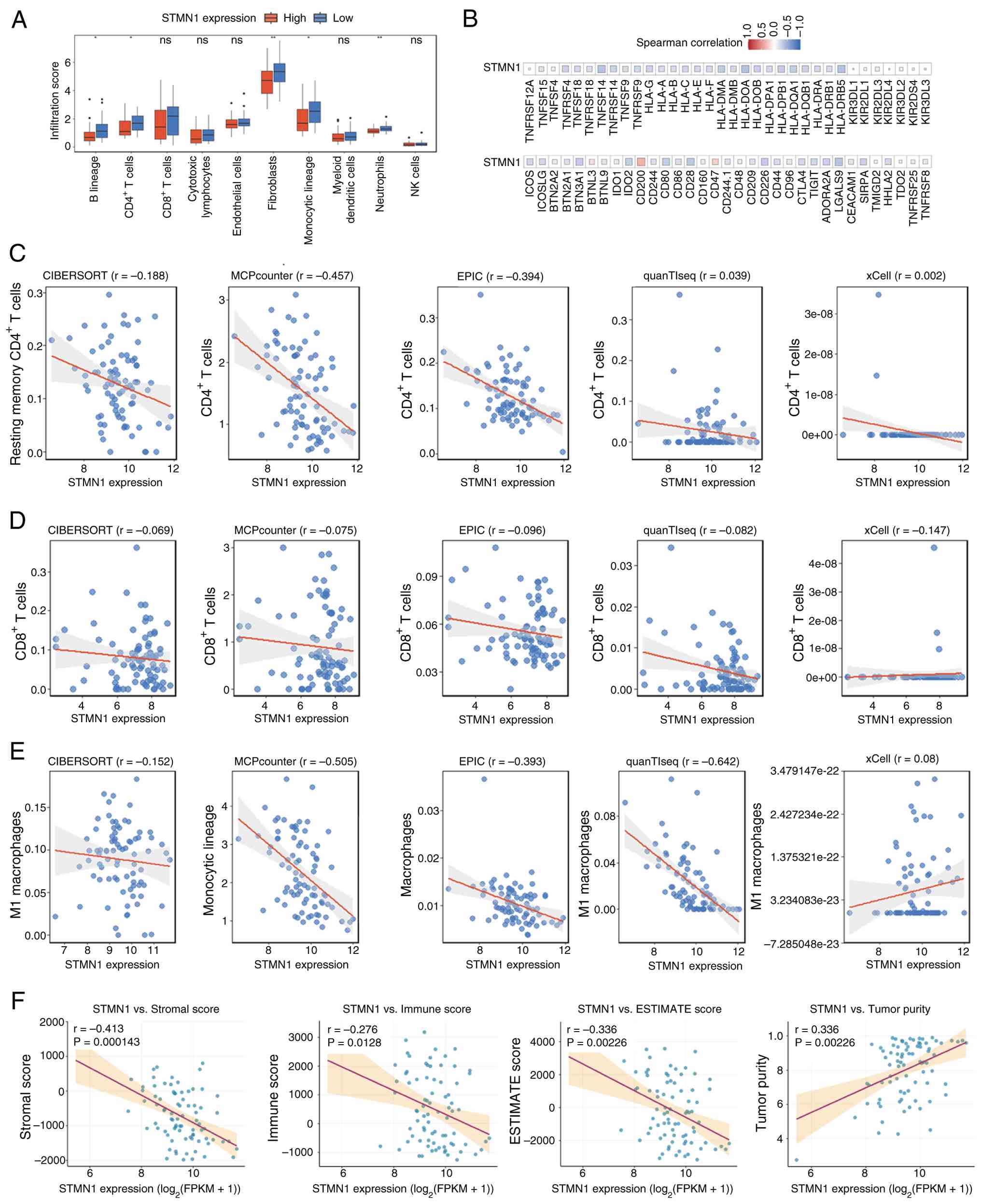 Immune cell infiltration profiling revealed that the infiltration scores of B lineage cells, CD4+ T cells, fibroblasts, monocytic lineage cells and neutrophils were significantly lower in the high STMN1 expression group as compared with those in the low STMN1 expression group (Fig. 3A). The correlation analysis of STMN1 expression and immune checkpoint molecules further revealed an inverse association between STMN1 and most immune checkpoint molecules (Fig. 3B), suggesting a potential role of STMN1 in modulating checkpoint-mediated immune suppression. In order to validate the association between STMN1 and key antitumor immune cells, the infiltration abundances of CD4+ and CD8+ T cells and M1 macrophages were quantified using five independent algorithms (CIBERSORT, MCPcounter, EPIC, quanTIseq and xCell). All of the algorithms demonstrated a weak inverse correlation between STMN1 expression and the infiltration of these three cell types (Fig. 3C-E), highlighting the association between STMN1 and reduced antitumor immune cell infiltration. ESTIMATE algorithm-derived immune scores combined with Spearman's rank correlation analysis confirmed that high STMN1 expression was weakly negatively correlated with the overall immune score (r=−0.276; Fig. 3F). These results indicated that STMN1 high expression may be associated with the characteristics of an immunosuppressive TME in lung cancer, suggesting a potential role of STMN1 in regulating TME immune status.