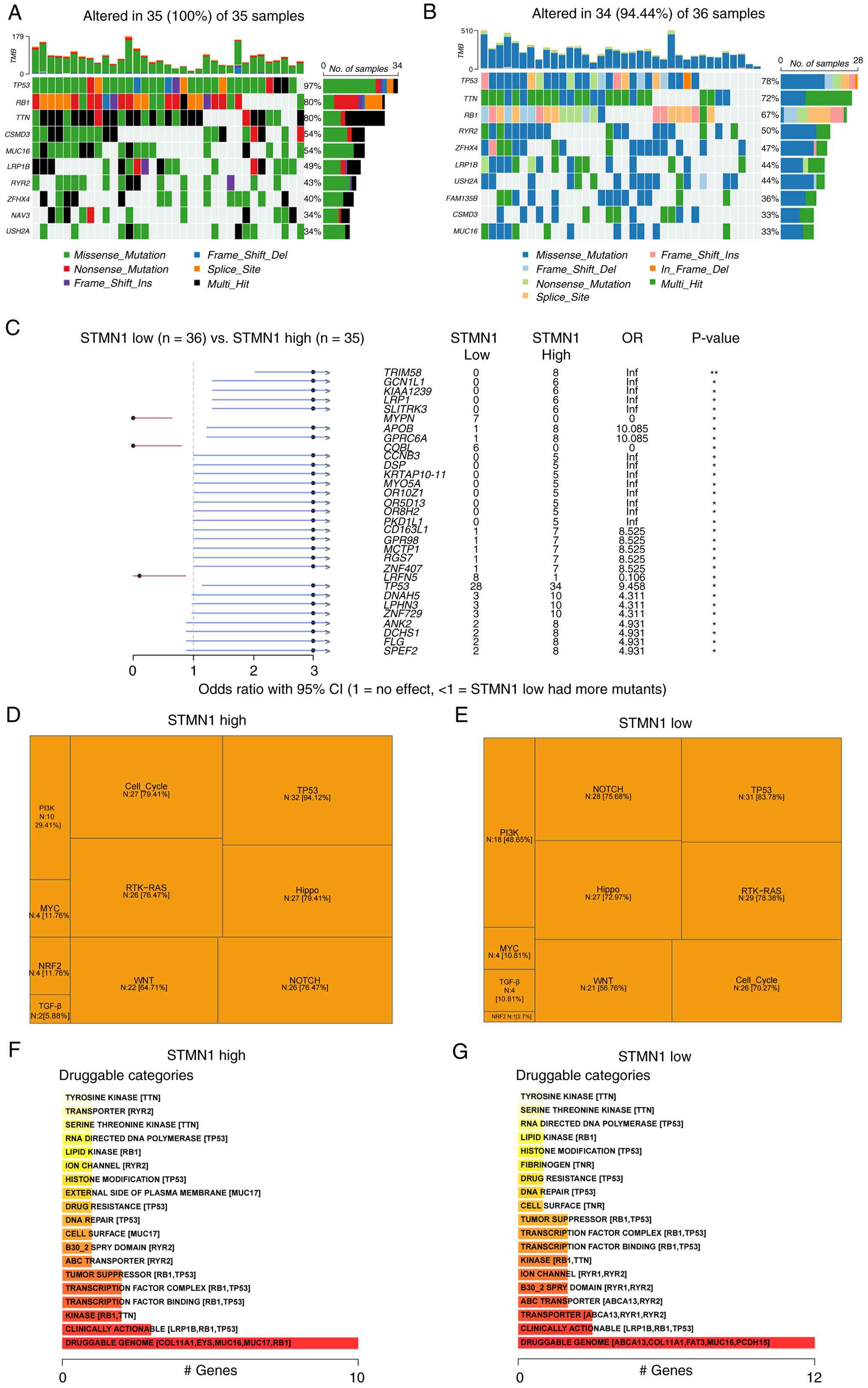 Waterfall plots visualized the genetic mutation patterns of lung cancer samples across STMN1 expression subgroups. In the high STMN1 expression group (Fig. 4A), all 35 lung cancer samples (100%) harbored genetic mutations. Moreover, 34 of 36 samples (94.44%) in the low STMN1 expression group (Fig. 4B) exhibited genetic alterations, with mutation types comparable to those in the high STMN1 expression subgroup. OR analysis was performed to quantify the association between STMN1 expression and gene mutation status. Numerous genes, including TRIM58, GCN1L1, KIAA1239, LRP1, SLITRK3, APOB, GPRC6A and TP53, showed an OR of >1, indicating a higher mutation probability in the high STMN1 expression group. On the other hand, genes such as MYPN, COBL and LRFN5, had an OR of <1, suggesting a lower mutation probability with high STMN1 expression (Fig. 4C).
