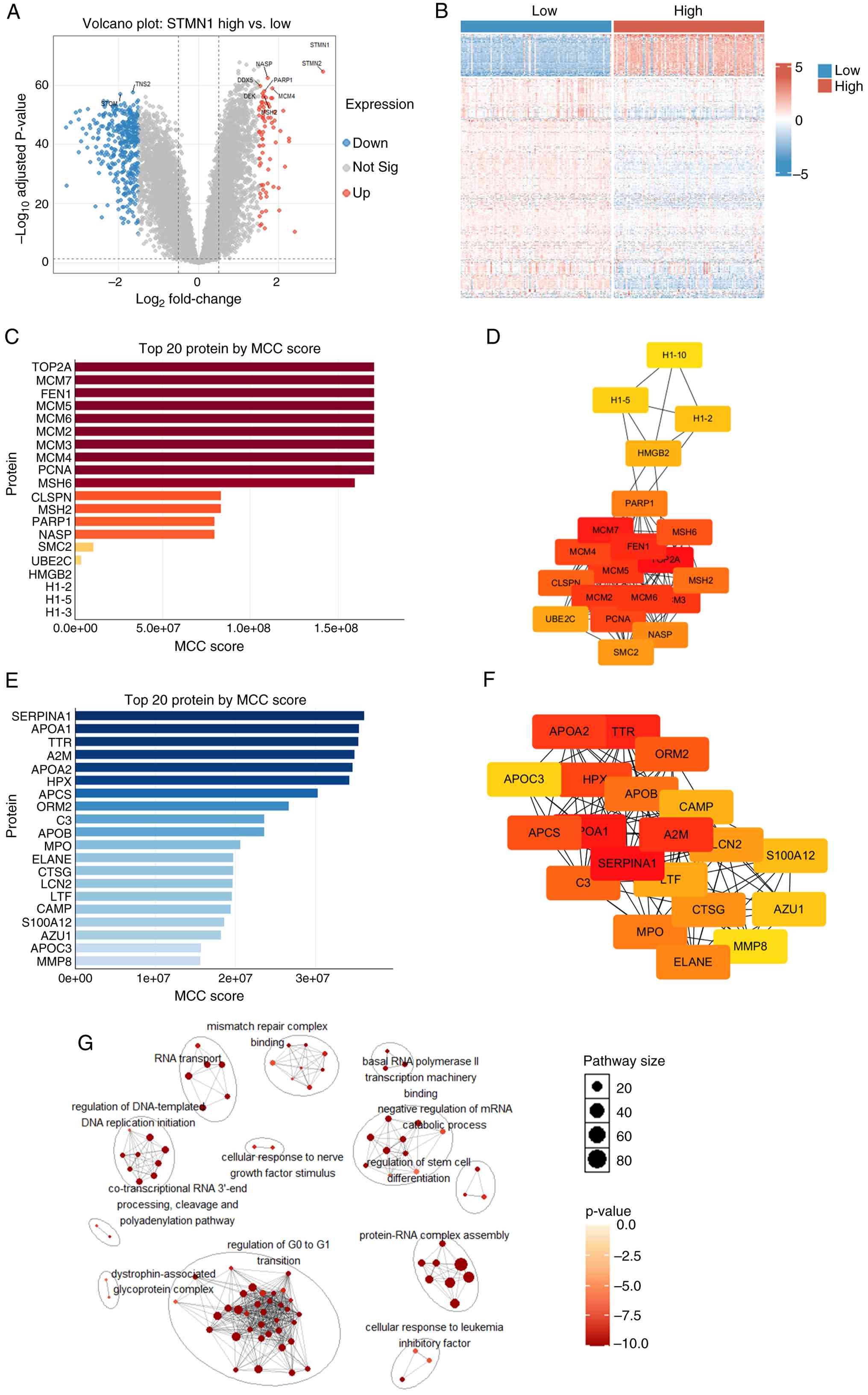 To identify the proteins associated with varying STMN1 expression levels, the protein expression patterns were visualized using volcano plots and heatmaps. These analyses revealed 452 differentially expressed proteins, including 72 upregulated and 380 downregulated proteins (Fig. 5A and B). Next, a PPI network was drawn, and Cytoscape software was used to select hub proteins from the top 20 upregulated and top 20 downregulated proteins (Fig. 5C-F).