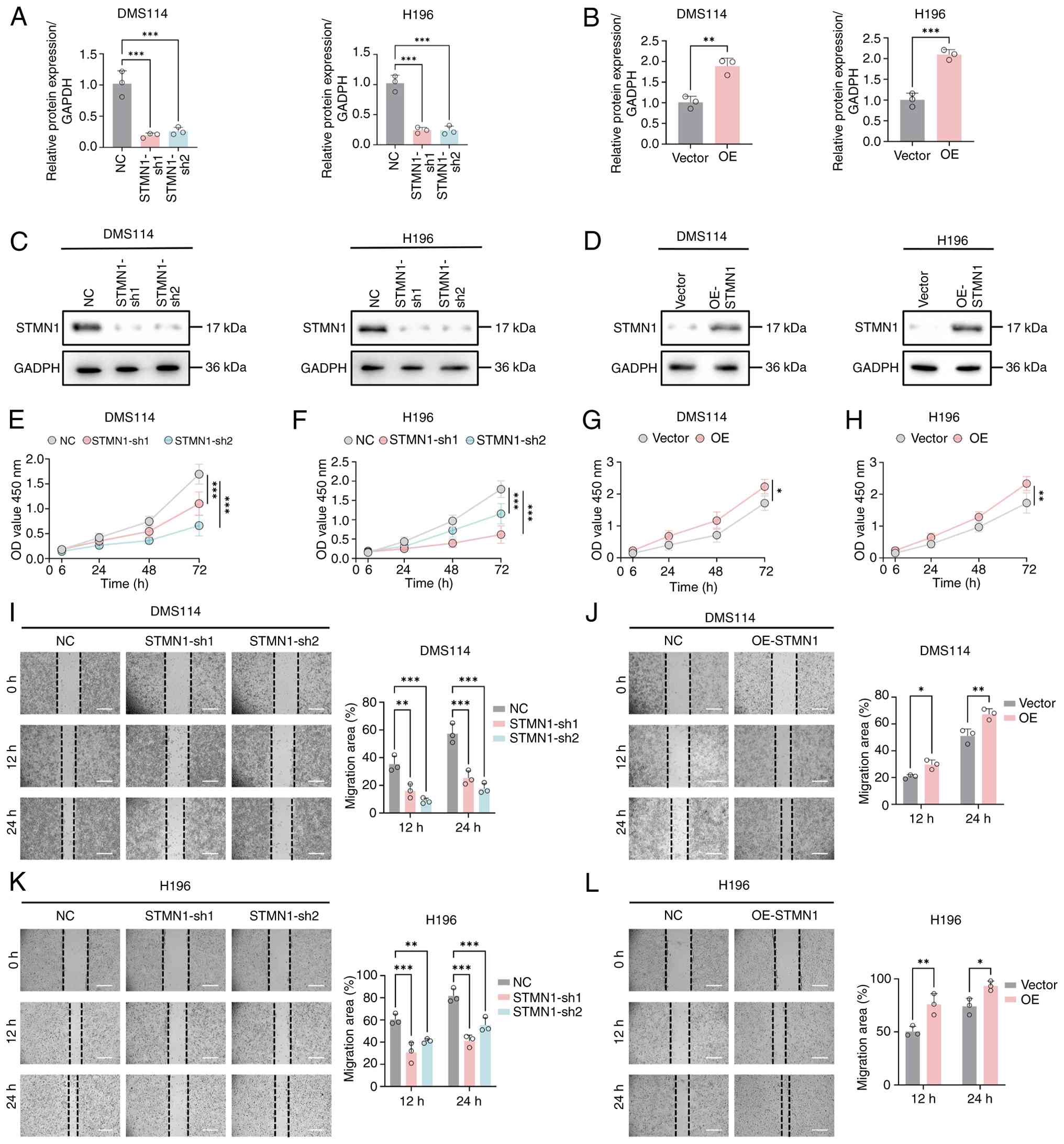 The effects of STMN1 expression were further assessed using cells transduced with NC, STMN1-sh1, STMN1-sh2, vector and STMN1-OE. Western blotting was performed to verify the efficiency of STMN1 knockdown and overexpression in DMS114 and H196 cells (Fig. 6A-D). In both cell lines, STMN1-sh1 and STMN1-sh2 significantly reduced STMN1 protein expression compared with the negative control group (Fig. 6A and C). Conversely, OE-STMN1 markedly increased STMN1 protein levels relative to the vector control (Fig. 6B and D). These results confirmed the successful construction of stable STMN1-knockdown and -overexpression cell lines for subsequent functional assays. Subsequently, CCK-8 assays demonstrated that STMN1 knockdown significantly suppressed cell proliferation in both DMS114 and H196 cells, whereas STMN1-OE transduction significantly accelerated cell proliferation (Fig. 6E-H). Moreover, wound healing assays showed that STMN1 knockdown markedly impaired cell migration in both DMS114 and H196 cells, whereas its overexpression significantly accelerated cell migration (Fig. 6I-L).