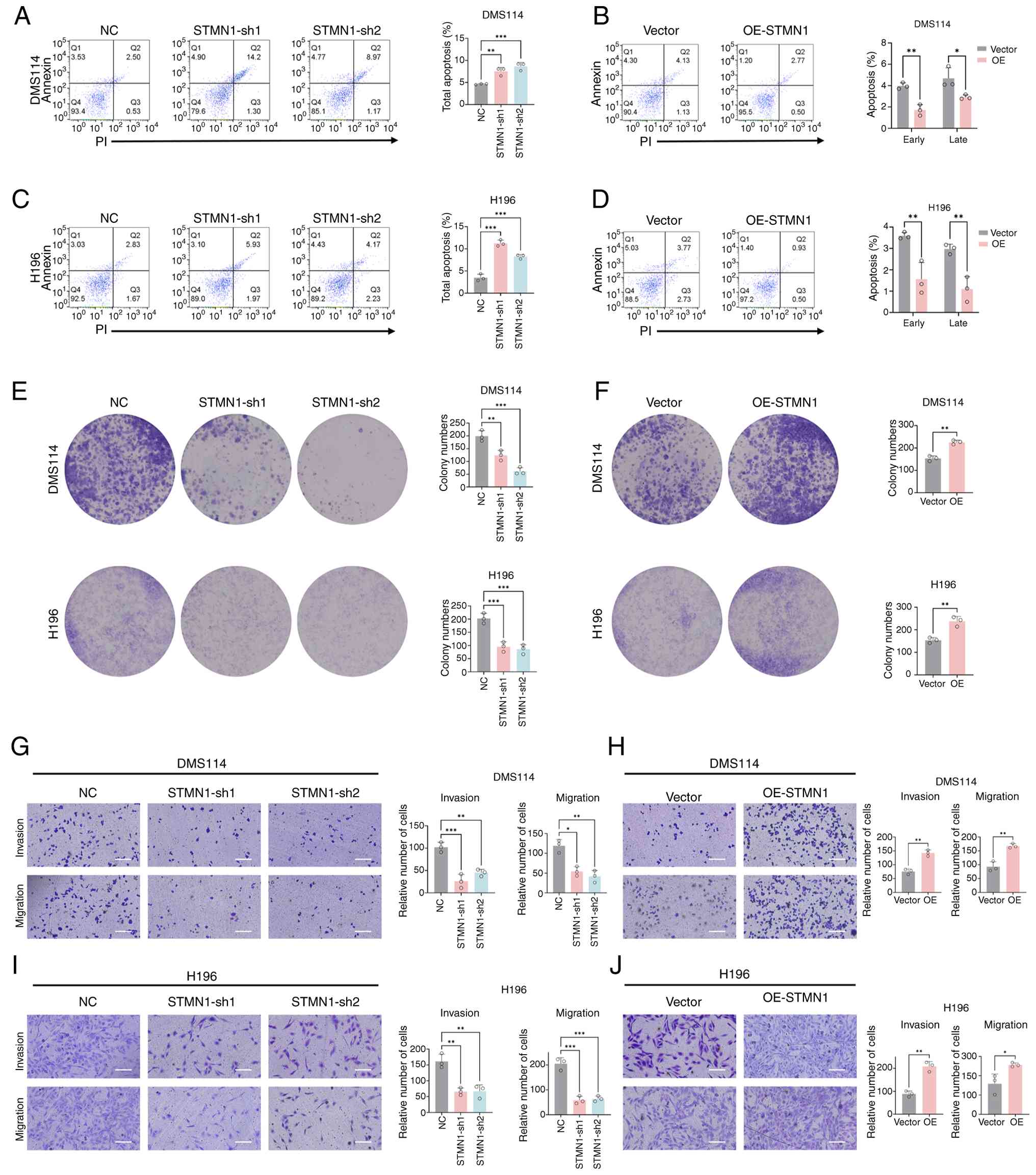 To characterize the functional role of STMN1 in lung cancer, its effects on apoptosis, colony formation and invasion/migration were assessed in DMS114 and H196 cells. Flow cytometric analysis showed that STMN1 knockdown significantly enhanced apoptosis in both cell lines. Total apoptosis rate was significantly higher in the STMN1-sh groups compared with the control group. By contrast, STMN1 overexpression modestly decreased apoptosis, indicating that the pro-apoptotic effect of STMN1 seems to be mainly achieved through its knockdown rather than overexpression (Fig. 7A-D). Colony formation assays revealed that STMN1 knockdown markedly diminished colony-forming ability, which was evidenced by fewer and smaller colonies compared with that in the NC group (Fig. 7E and F). By contrast, STMN1-OE transduction significantly enhanced this capacity. Additionally, Transwell assays demonstrated that STMN1 knockdown impaired invasive and migratory capacities (with fewer membrane-penetrating cells), whereas its overexpression significantly elevated these abilities (Fig. 7G-J).