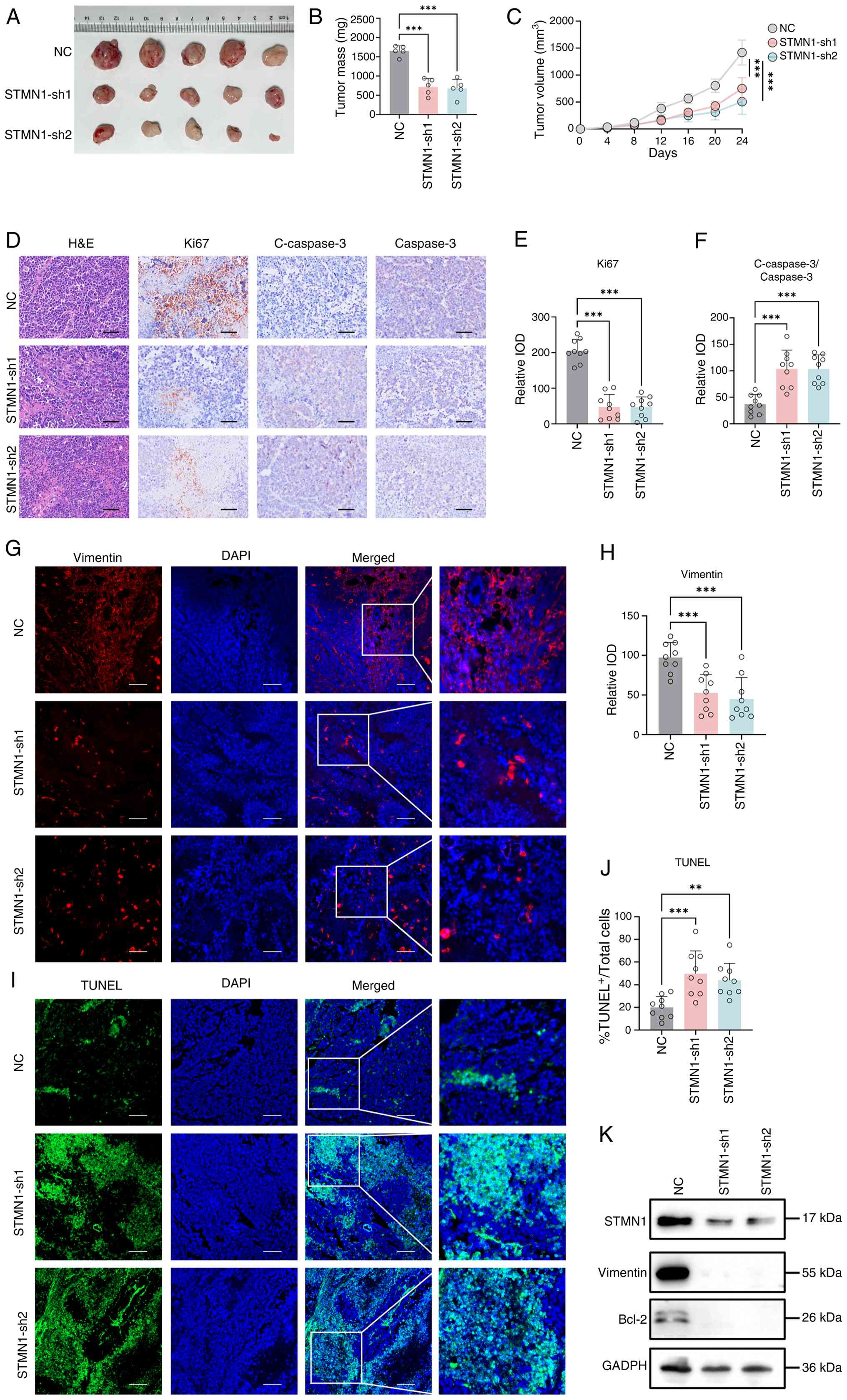 A murine shRNA model targeting STMN1 was established to assess the in vivo effects of STMN1. As compared with in the NC group, both STMN1-sh1 and -sh2 groups exhibited reduced tumor volumes (Fig. 8A), decreased tumor weights (Fig. 8B) and slower tumor growth kinetics (Fig. 8C). The maximum tumor volume was 1,654 mm3, corresponding to a maximum diameter of 15 mm. H&E staining and immunohistochemical analysis revealed that STMN1 knockdown was associated with reduced expression of the proliferation marker Ki67, and elevated levels of the apoptosis marker C-Caspase-3/Caspase-3 in tumor tissues (Fig. 8D-F). Immunofluorescence staining demonstrated that Vimentin expression was reduced in the STMN1-sh1 and -sh2 groups, indicating impaired epithelial-mesenchymal transition (EMT) progression (Fig. 8G and H). The TUNEL assay further confirmed a significant increase in apoptotic cells in STMN1-knockdown tumors (Fig. 8I and J). Western blotting validated these findings, showing downregulated Vimentin and Bcl-2 (anti-apoptotic protein) expression levels in the STMN1-sh1 and -sh2 groups (Fig. 8K). These results were consistent with the enhanced apoptosis and suppressed EMT. STMN1 knockdown efficiency was also confirmed in tumor tissues (Fig. 8K). Collectively, these results indicated that STMN1 knockdown could induce tumor regression by suppressing cell proliferation, enhancing apoptosis and impairing EMT in vivo.