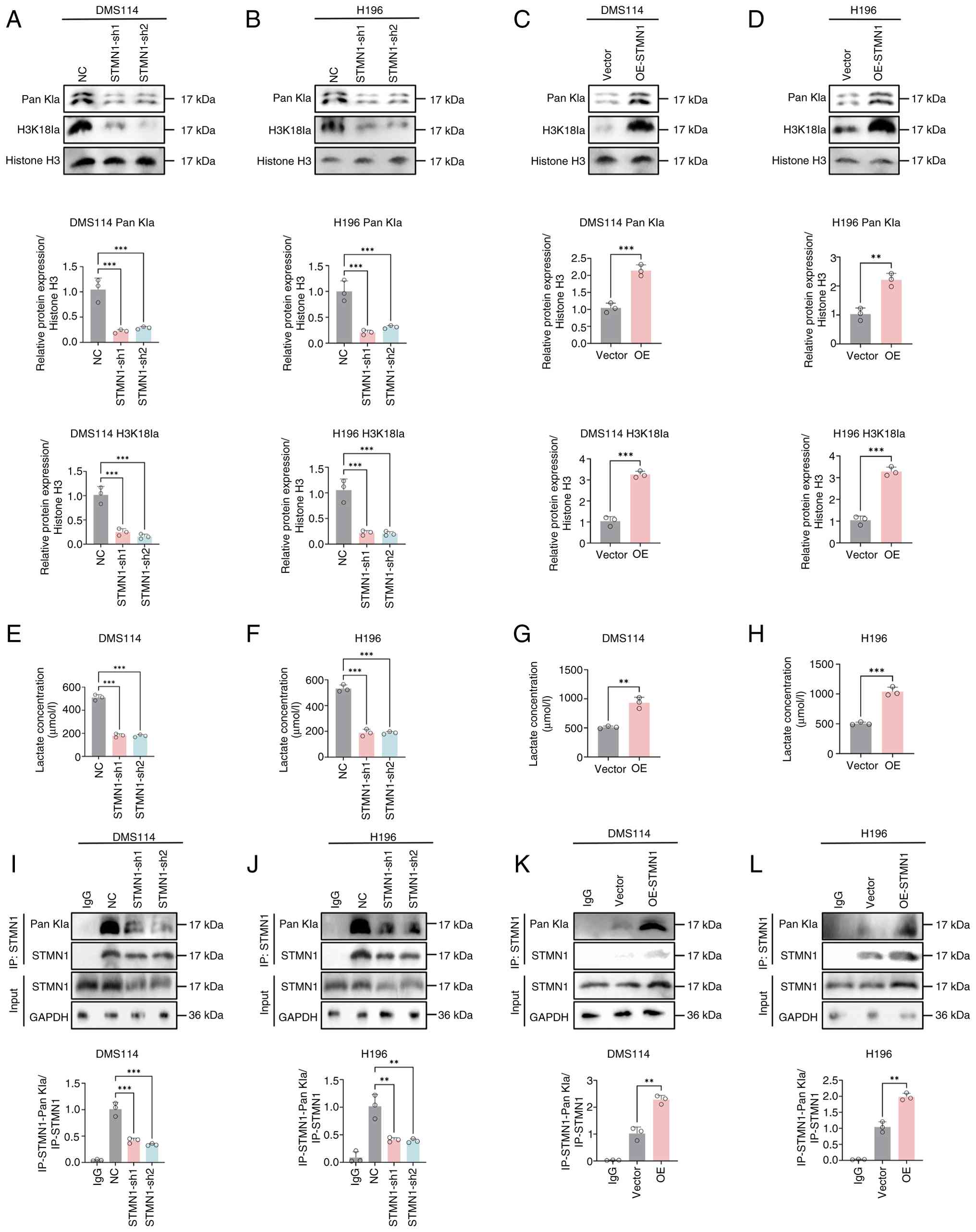 To elucidate the effect of STMN1 on histone lactylation, histones were extracted from DMS114 and H196 cells following STMN1 knockdown or overexpression. The levels of Pan Kla and H3K18la were decreased upon STMN1 knockdown and increased upon STMN1 overexpression, demonstrating that STMN1 promotes histone lactylation (Fig. 9A-D).