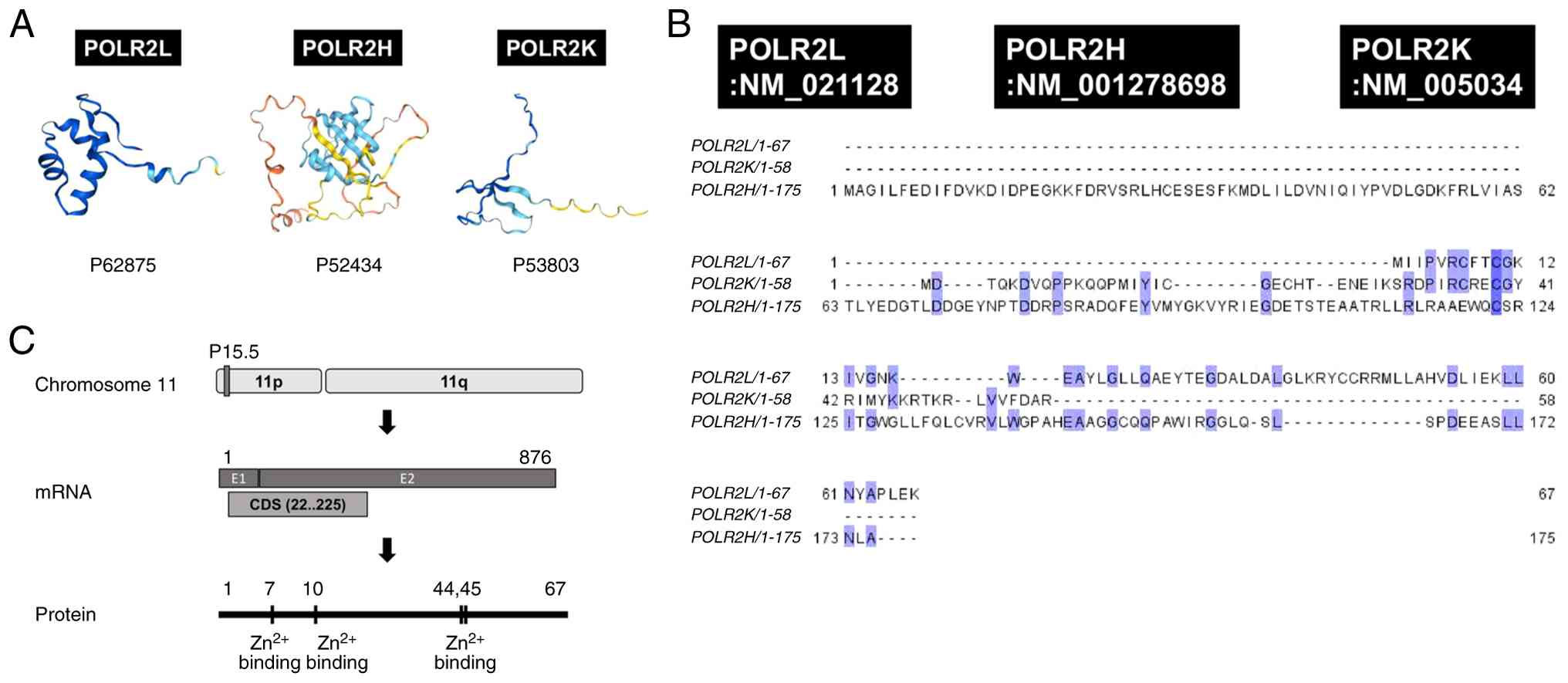 To contextualize the structural and functional role of POLR2L within the RNA polymerase II complex, we performed a comparative structural, sequence-based analysis of POLR2L alongside two other small Pol II subunits, POLR2H and POLR2K (8,9,22). Pol II plays a central role in the gene expression of eukaryotic cells, facilitating the transcription of both protein-coding mRNAs and various ncRNAs (2,6). Of the 12 subunits that constitute the Pol II complex, POLR2L is a small (7.6 kDa), highly conserved subunit, reflecting its profound evolutionary significance (6,23). As shown in Fig. 1A, AlphaFold-based structural models have suggested that POLR2L adopts a compact globular fold with a surface-exposed zinc-binding pocket (12,24), whereas POLR2H and POLR2K display more extended conformations with distinct surface charge distributions (2,25). Although this in silico prediction should be interpreted as hypothesis-generating and requires experimental validation, such differences support the notion that POLR2L may provide a flexible interaction module that can bridge specific subunits within the Pol II core, in contrast to the mainly architectural roles proposed for POLR2H and POLR2K (26,27).