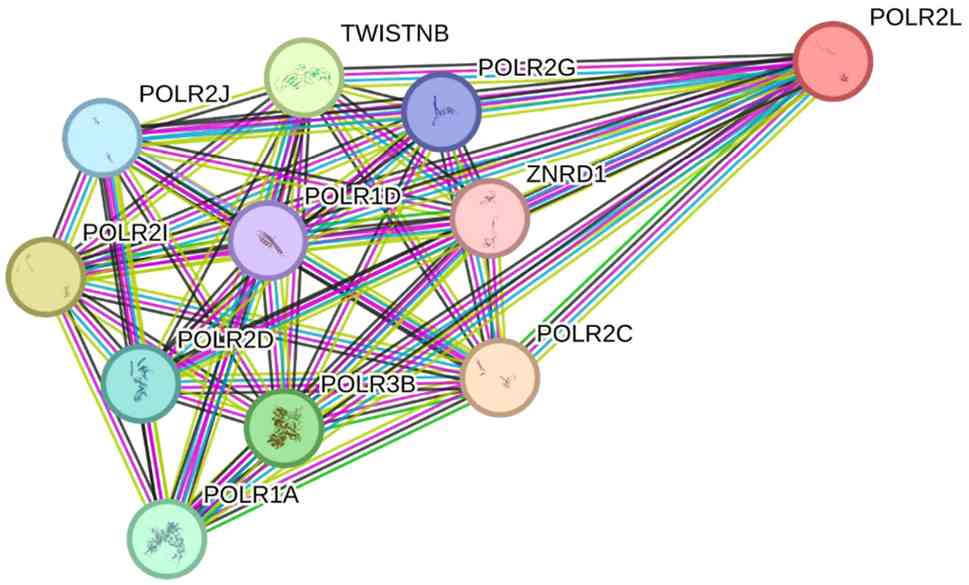 Increased POLR2L expression has also been observed in gastric cancer, associated with poorer patient prognosis (38). Patients with elevated POLR2L levels often exhibit more rapid tumor progression and enhanced resistance to chemotherapy (16). Targeting of POLR2L structural stability may be useful in the treatment of gastric cancer (16).