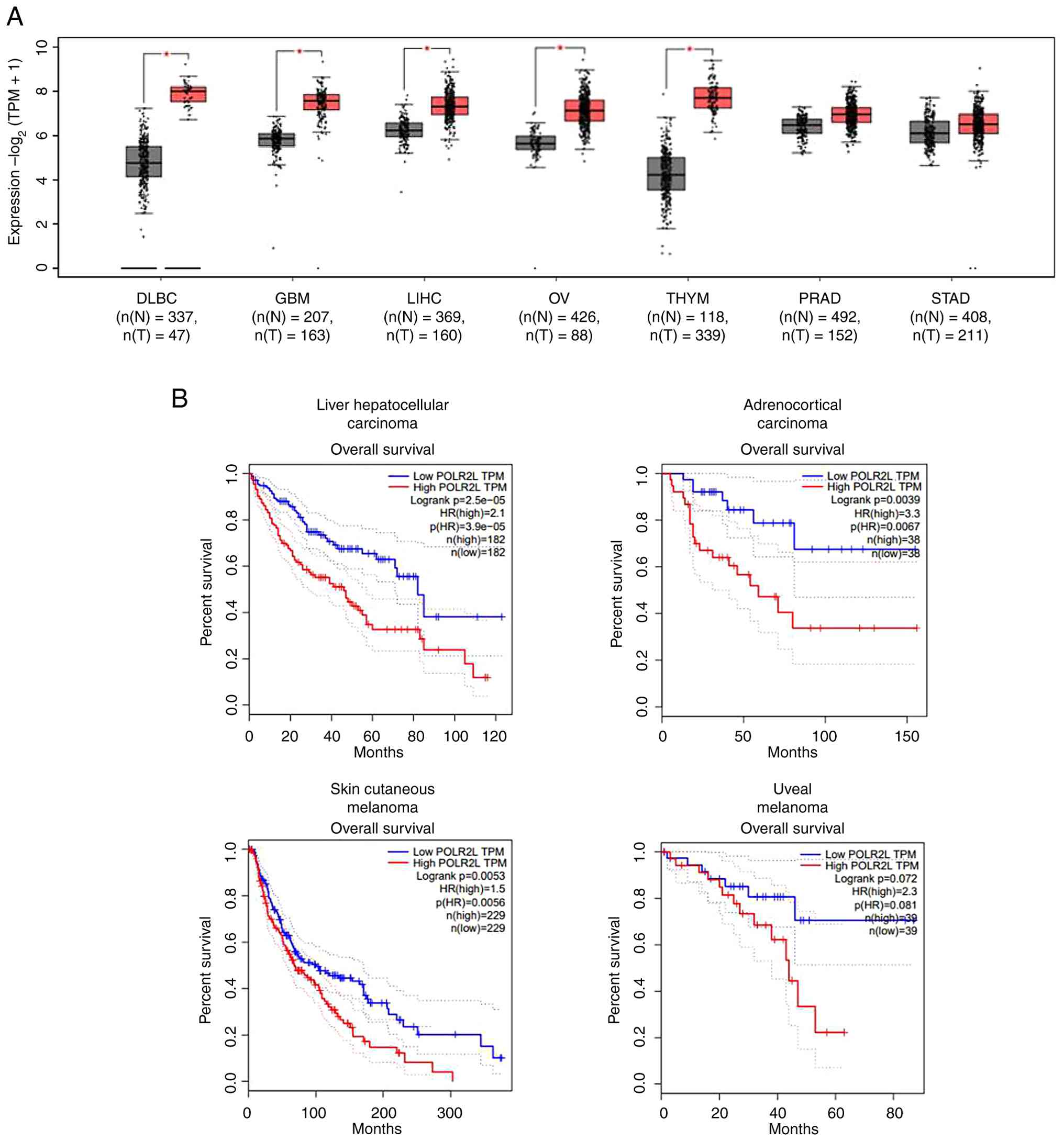 POLR2L regulates gene expression during various physiological processes. POLR2L dysregulation has been increasingly associated with pathogenesis, particularly cancer, where increased POLR2L expression may contribute to tumor progression, drug resistance, and modulation of the immune response (16). Transcriptomic data revealed that POLR2L expression was significantly elevated in several tumor types compared to the corresponding normal tissues, including diffuse large B-cell lymphoma (DLBC), glioblastoma multiforme (GBM), liver hepatocellular carcinoma (LIHC), ovarian cancer (OV), thymoma (THYM), prostate adenocarcinoma (PRAD), and stomach adenocarcinoma (STAD) (Fig. 3A). POLR2L expression levels were linked to survival rates of patients with liver hepatocellular carcinoma (HCC), adrenocortical carcinoma, skin cutaneous melanoma, and uveal melanoma (Fig. 3B). POLR2L can thus serve as both a prognostic biomarker of and a possible therapeutic target for cancer.