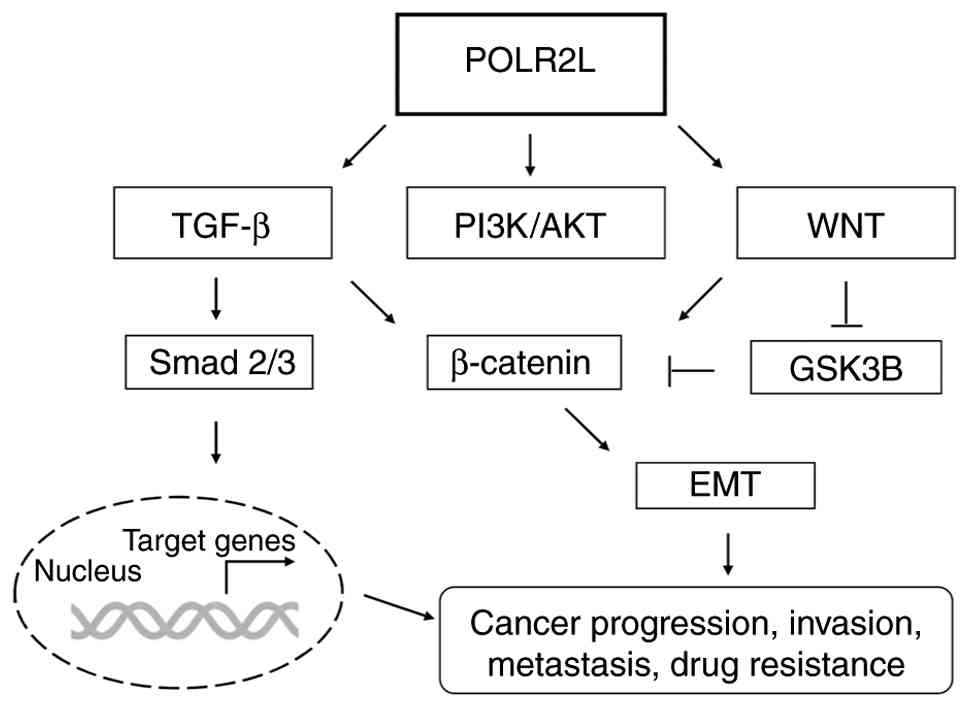 The Wnt/β-catenin pathway is essential for cell differentiation and tissue homeostasis, and plays major roles in cancer development and metastasis (76). POLR2L modulates this pathway by regulating β-catenin transcription and activating downstream target genes. POLR2L enhanced the transcription of Wnt target genes, including CCND1 and MYC (76). Activation of β-catenin via POLR2L-dependent transcription promoted cancer cell proliferation and motility (77) (Fig. 4). POLR2L regulated the Wnt/β-catenin pathways of prostate and liver cancers (78). POLR2L inhibition triggered pathway deactivation, reducing cancer cell invasiveness and metastasis (77). These findings suggest that POLR2L could serve as a promising therapeutic target when seeking to block Wnt/β-catenin signaling in cancer patients (77).