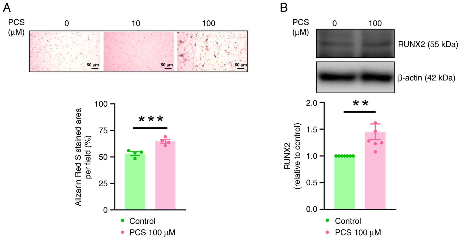 Aortic VICs (1×105/well in the 6-well plate) were cultured in DMEM/F12 medium in a cell culture incubator at 37°C for 7 days in the presence or absence of PCS (10 and 100 µM; APExBIO Technology LLC). The present study selected a PCS concentration of 100 µM to reflect the comparatively high PCS levels observed in advanced CKD (27). To clarify the underlying mechanism of PCS activity on VIC calcification, VICs were also incubated with PX-478 (0.5 µM; cat. no. HY-10231; MedChemExpress), recombinant klotho (100 pM; cat. no. APA798Hu02; Cloud-Clone Corp. CCC) and the SIRT1 activator SRT1720 (1 mM; cat. no. CAS 925434-55-5; Calbiochem; Merck KGaA) at 37°C and refreshed every 24 h before further analysis.