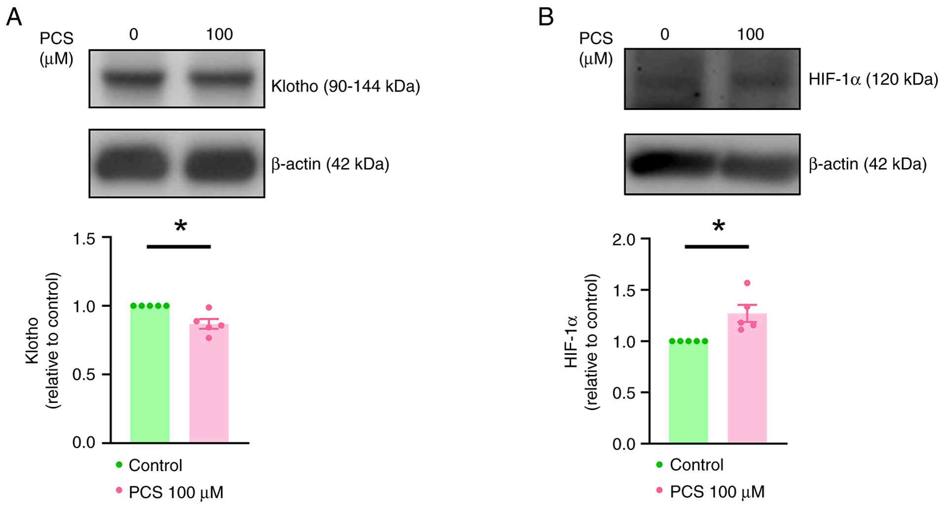 The present study incubated VICs with 10 and 100 µM PCS to investigate the effect of PCS on VIC calcification, as well as its impact on RUNX2 expression. The present study observed that, compared with untreated VICs, incubation with 100 µM PCS significantly increased VIC calcification (Fig. 1A) and RUNX2 protein expression (Fig. 1B). Furthermore, treatment with PCS significantly decreased klotho expression and significantly increased HIF-1α expression in VICs (Fig. 2).