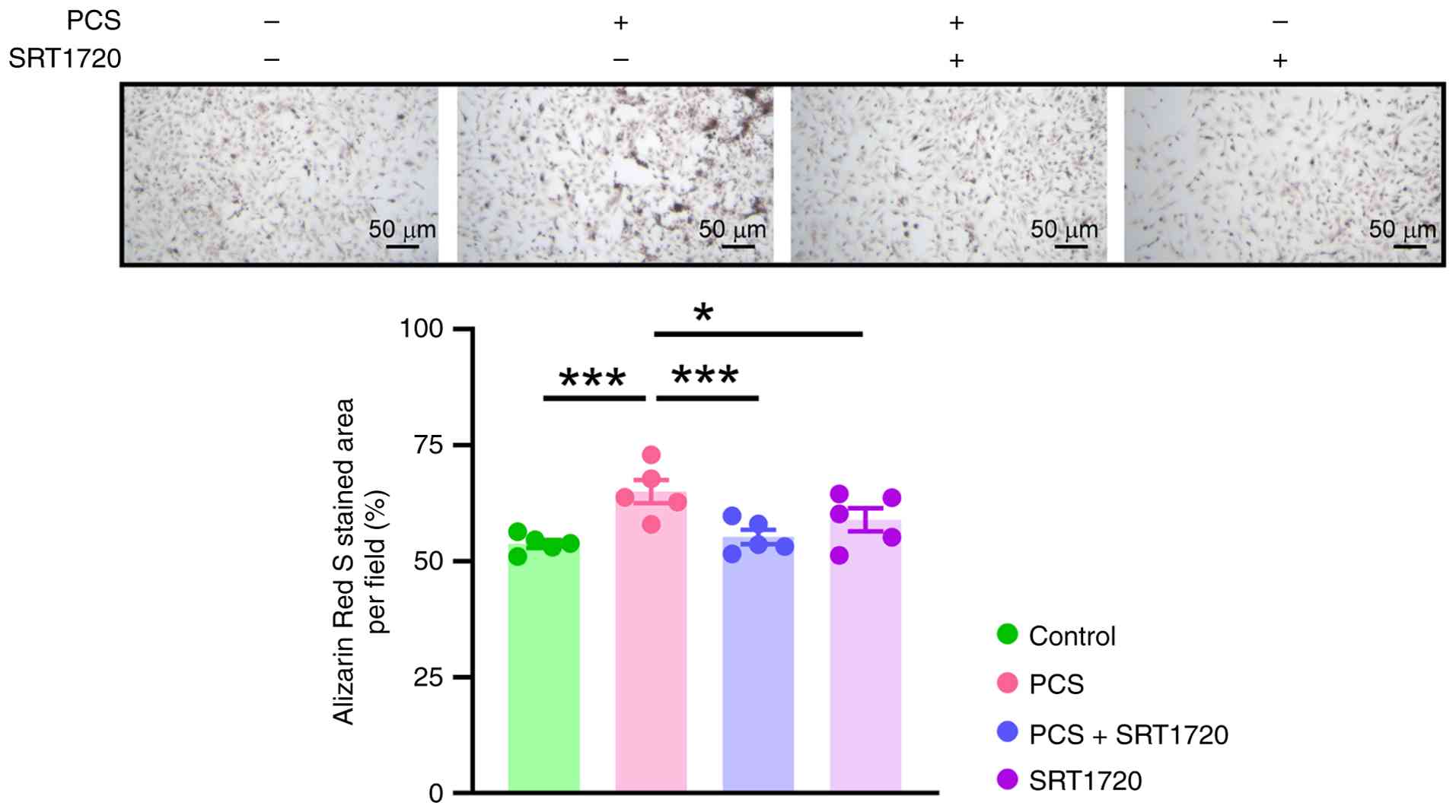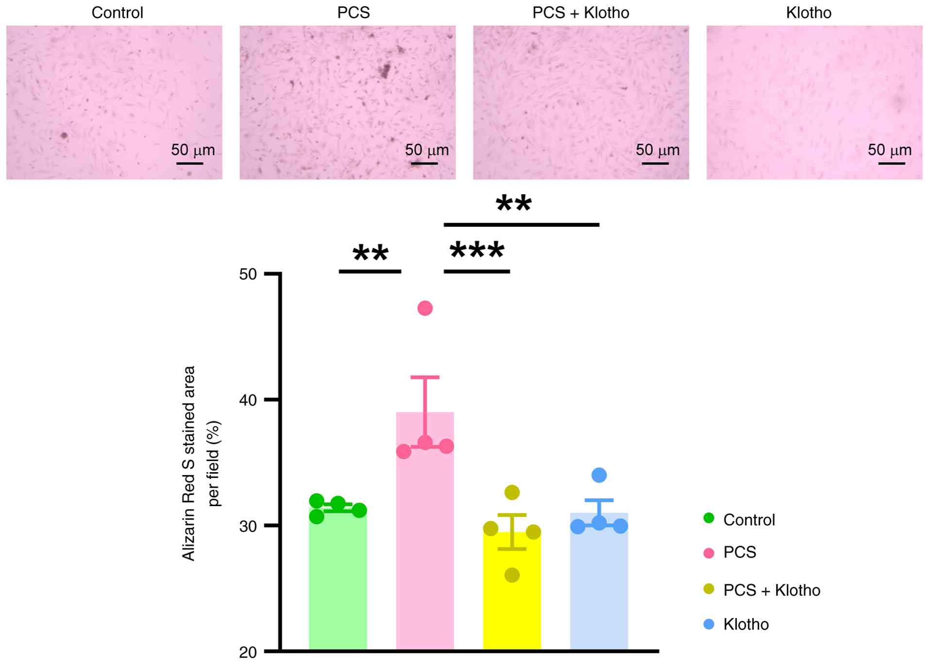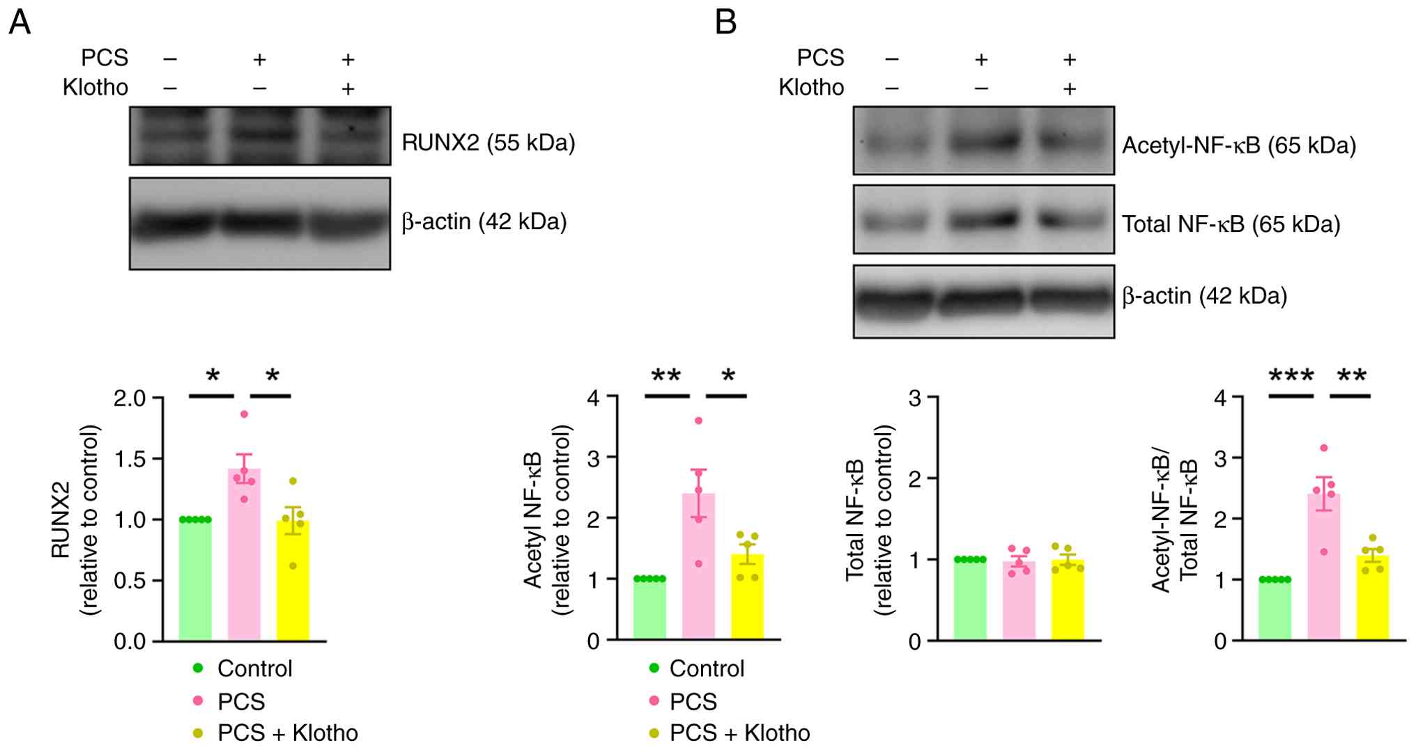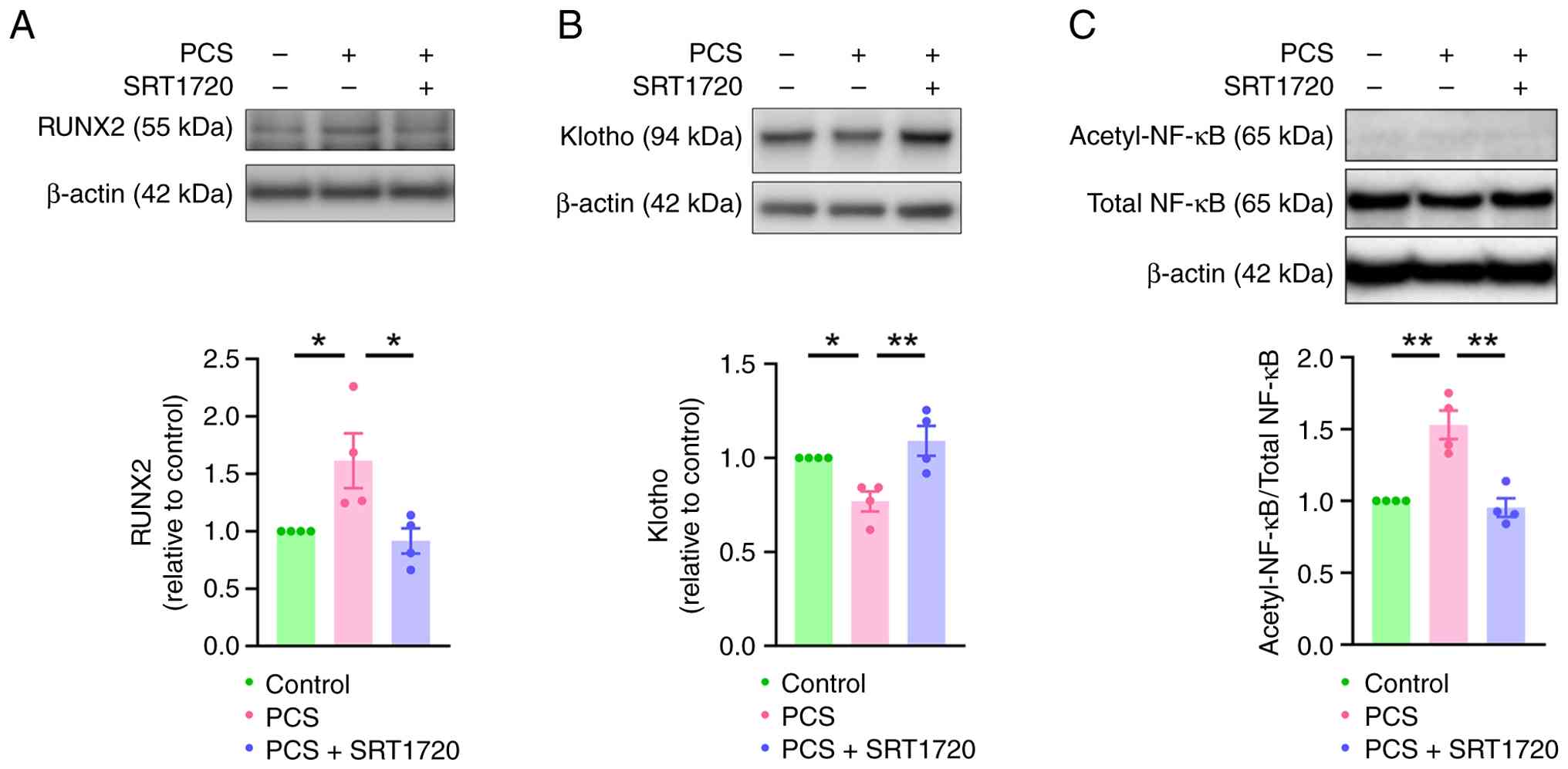Similarly, the present study examined the effects of SIRT1 on PCS-treated VICs. ARS staining revealed that SRT1720 (1 mM), a SIRT1 activator, significantly reduced PCS-induced VIC calcification (Fig. 6). Furthermore, SRT1720 significantly attenuated PCS-mediated downregulation of klotho and significantly reduced PCS-enhanced RUNX2 expression in VICs (Fig. 7). PCS administration also resulted in the elevation of NF-kB acetylation compared with the control group, which was significantly mitigated by co-treatment with klotho. These findings suggested that activation of the klotho/SIRT1 axis was important for preventing PCS-induced VIC calcification.