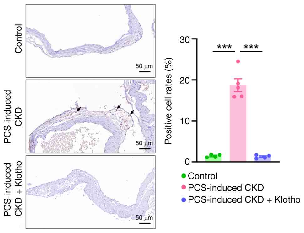 The present study developed a PCS-induced rat model of CKD to evaluate whether klotho played a role in the CKD-mediated upregulation of RUNX2. Rats were treated with recombinant klotho protein for a total of 8 weeks. IHC revealed that PCS-induced CKD model rats exhibited a significant increase in RUNX2 expression in the AV leaflet (Fig. 8). Treatment with recombinant klotho mitigated the CKD-mediated upregulation of RUNX2 in PCS-induced model rats.