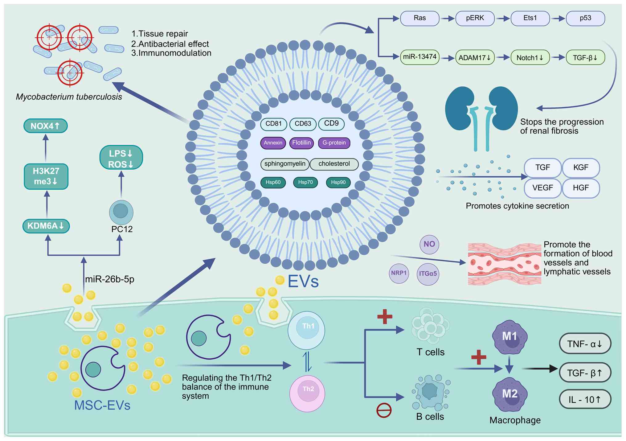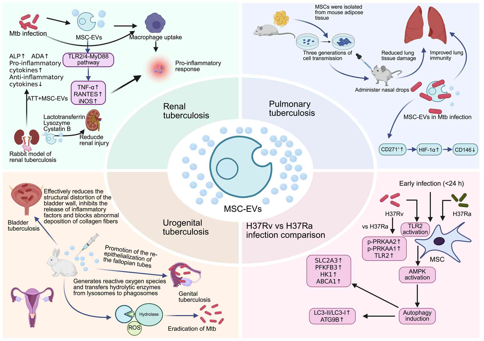 EVs exhibit therapeutic relevance in TB. Host- or pathogen-derived EVs carry pathogenic antigens, regulating immune responses, metabolism and cell death (112). Specifically, EVs from Mtb-infected cells control inflammatory cytokines through antigen presentation, transmit immunoregulatory molecules to T helper cells and promote adaptive immune responses (113,114). Studies have shown that infection with Mtb promotes the release of MSC-EVs without affecting MSC proliferation; these vesicles can be internalized by macrophages and induce time-dependent pro-inflammatory responses through upregulation of TNF-α, RANTES and iNOS. This process is primarily mediated via the TLR2/4-MyD88 signaling pathway, and in vivo experiments further demonstrate that EVs derived from Mtb-infected MSCs (Mtb-MSC-EVs) can trigger pro-inflammatory responses in mice even during anti-TB treatment (87). A rabbit model of renal TB was established by injecting Mtb H37Rv into the renal cortical parenchyma, followed by intravenous administration of MSC-EVs in combination with standard anti-TB therapy (ATT). Compared with ATT alone, the combination treatment significantly increased serum anti-inflammatory cytokine levels while reducing pro-inflammatory cytokines and improving alkaline phosphatase, adenosine deaminase and body weight. Further analyses indicated that MSC-EVs are enriched with antimicrobial peptides such as lactotransferrin, lysozyme and cystatin B, as well as proteins with anti-inflammatory and immunomodulatory properties, suggesting a potential role in alleviating renal injury (15).