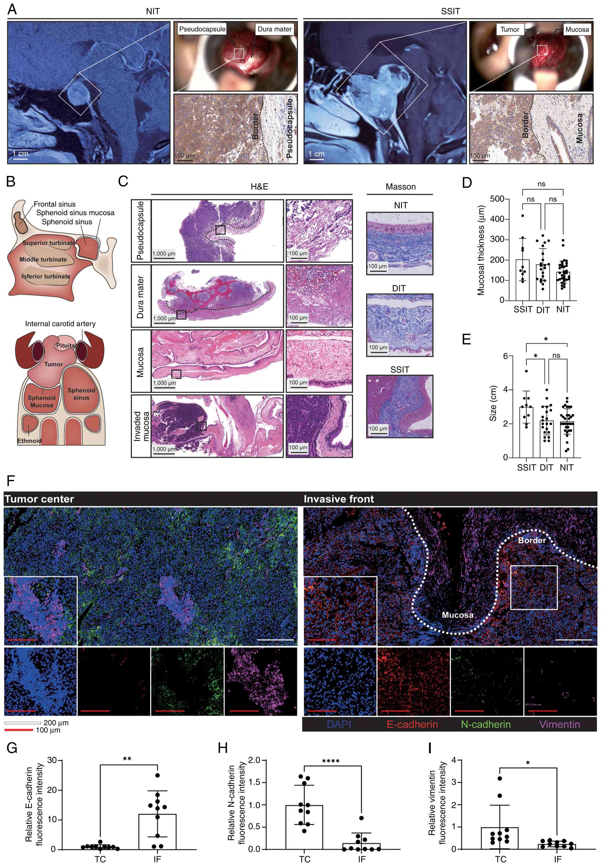 Intraoperative and pathological assessments demonstrated that, in all SSIT cases included in the present study, the lesion occupied the sphenoid sinus lumen but did not breach the sinus mucosal wall to allow further extension (Fig. 1A). For a PA, inferior extension into the sphenoid sinus requires a stepwise traversal of barriers, including penetration of the tumor pseudocapsule, violation of the dura mater and erosion of the sellar floor, before reaching the sinus cavity (Fig. 1B). Consistent with this trajectory, H&E staining demonstrated tumor cell infiltration into the pseudocapsule with focal dural disruption, while there was no infiltration or destruction of the basal layer of the sinus mucosa (Fig. 1C). Masson's trichrome staining revealed densely arranged collagen fibers within the sphenoid sinus mucosa in the SSIT group, and the mucosal thickness was comparable to that observed in the NIT and DIT groups (Fig. 1D). These observations suggested that pre-mucosal anatomical barriers (pseudocapsule, dura and sellar floor) alone may be insufficient to restrain tumor progression once erosion occurs, although they constitute relevant physical obstacles (21–23). Despite the larger tumor size in the SSIT group compared with that in the NIT and DIT groups (Fig. 1E), the proliferation index at the SSIT invasive front (IF) was significantly lower than that observed in the DIT group, but not significantly different from the NIT group (Fig. S1A and B).