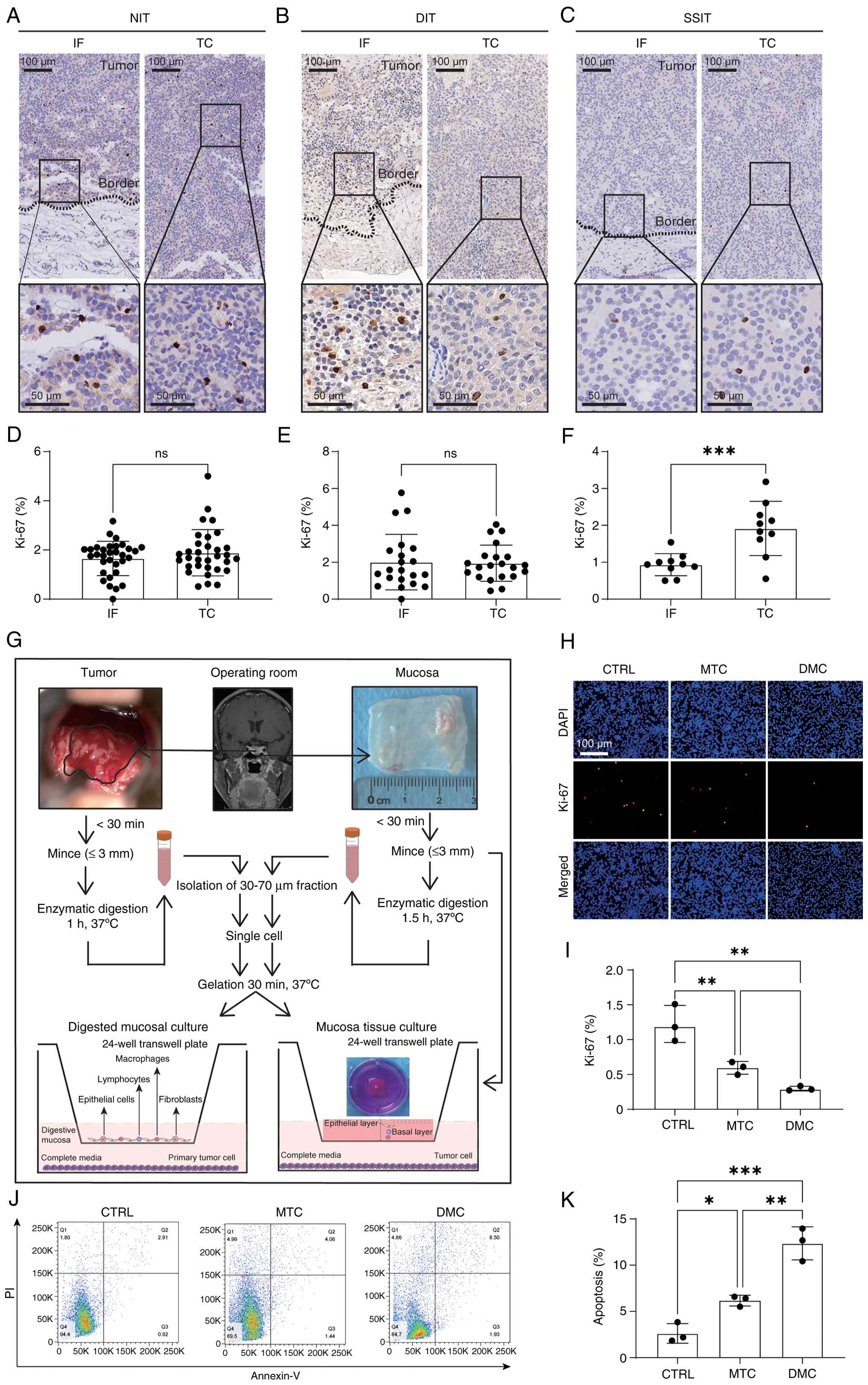 Air-liquid interface culture demonstrated that mucosal tissue viability declined markedly by day 7 (Fig. S2A and B). Following enzymatic digestion of the mucosa, fibroblast outgrowth from DMC preparations became evident from day 5 onward, indicating progressive changes in cellular composition during prolonged culture (Fig. S2C and D). Therefore, co-culture assays were conducted within the validated viability window, and 48-h co-culture with either MTC or DMC significantly reduced tumor cell proliferation (Fig. 2H and I) and increased tumor cell death (Fig. 2J and K) compared with those of tumor cells cultured alone (CTRL).