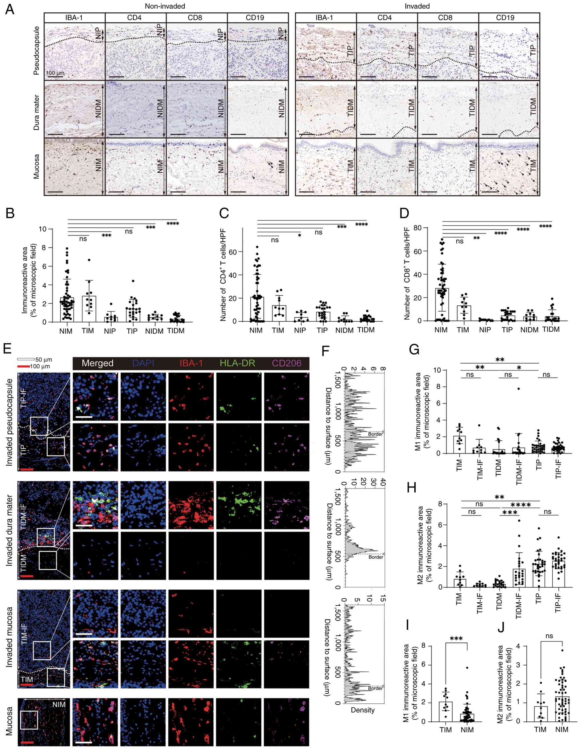 To resolve macrophage heterogeneity, multiplex immunofluorescence staining was used to phenotype IBA-1+ macrophages into HLA-DR+ (M1-like; pro-inflammatory) and CD206+ (M2-like; immunoregulatory) states (26). Macrophages were enriched at the IF of pseudocapsular and dural tissues (Fig. 3E and F). In mucosal tissues, the proportion of HLA-DR+ (M1-like) macrophages was higher in tumor-invaded mucosa than in pseudocapsule/dura tissues, whereas non-invaded mucosa remained M2-skewed (Figs. 3G-J and S3B-D). Collectively, these data indicated context-dependent remodeling of mucosal macrophage states adjacent to invasion and were consistent with a microenvironment associated with constraints on local tumor expansion.