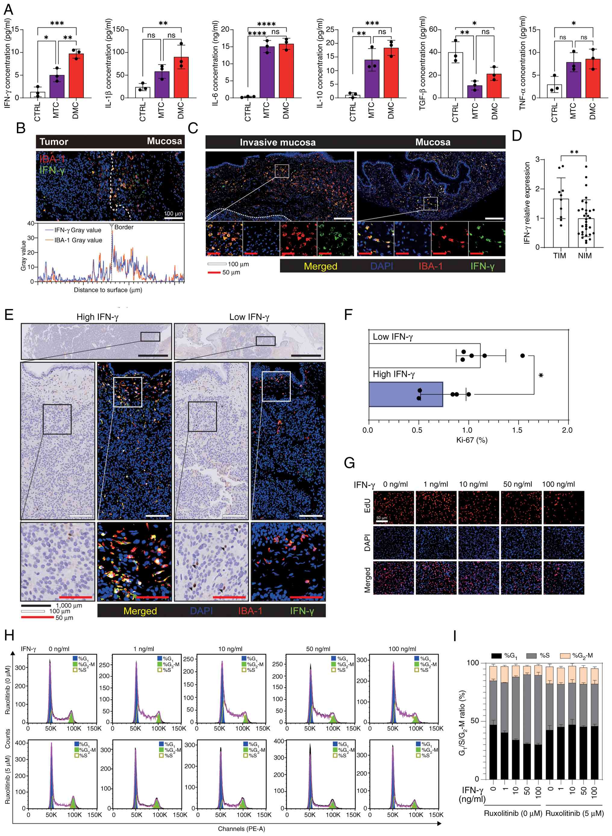 Cytokine dynamics were profiled using ELISAs in two co-culture systems. ELISA revealed that IFN-γ, IL-6 and IL-10 were increased in both the MTC and DMC group compared with the CTRL group, with higher IFN-γ levels in the DMC group (Fig. 4A). By contrast, TGF-β concentrations were reduced in both the MTC and DMC groups relative to the CTRL group (Fig. 4A). Spatial analyses demonstrated enrichment of TNF-α and IL-1β at the tumor-mucosa interface, consistent with a pro-inflammatory gradient in regions of invasion (Fig. S4A-D). Immunofluorescence staining indicated that the IFN-γ signal was enriched in mucosal macrophages and exceeded that in intratumoral macrophages, which was in line with the correlation between macrophage density and IFN-γ intensity (Figs. 4B and S4E). IFN-γ expression in SSIT mucosal macrophages also exceeded that in non-invaded mucosa (Fig. 4C and D).