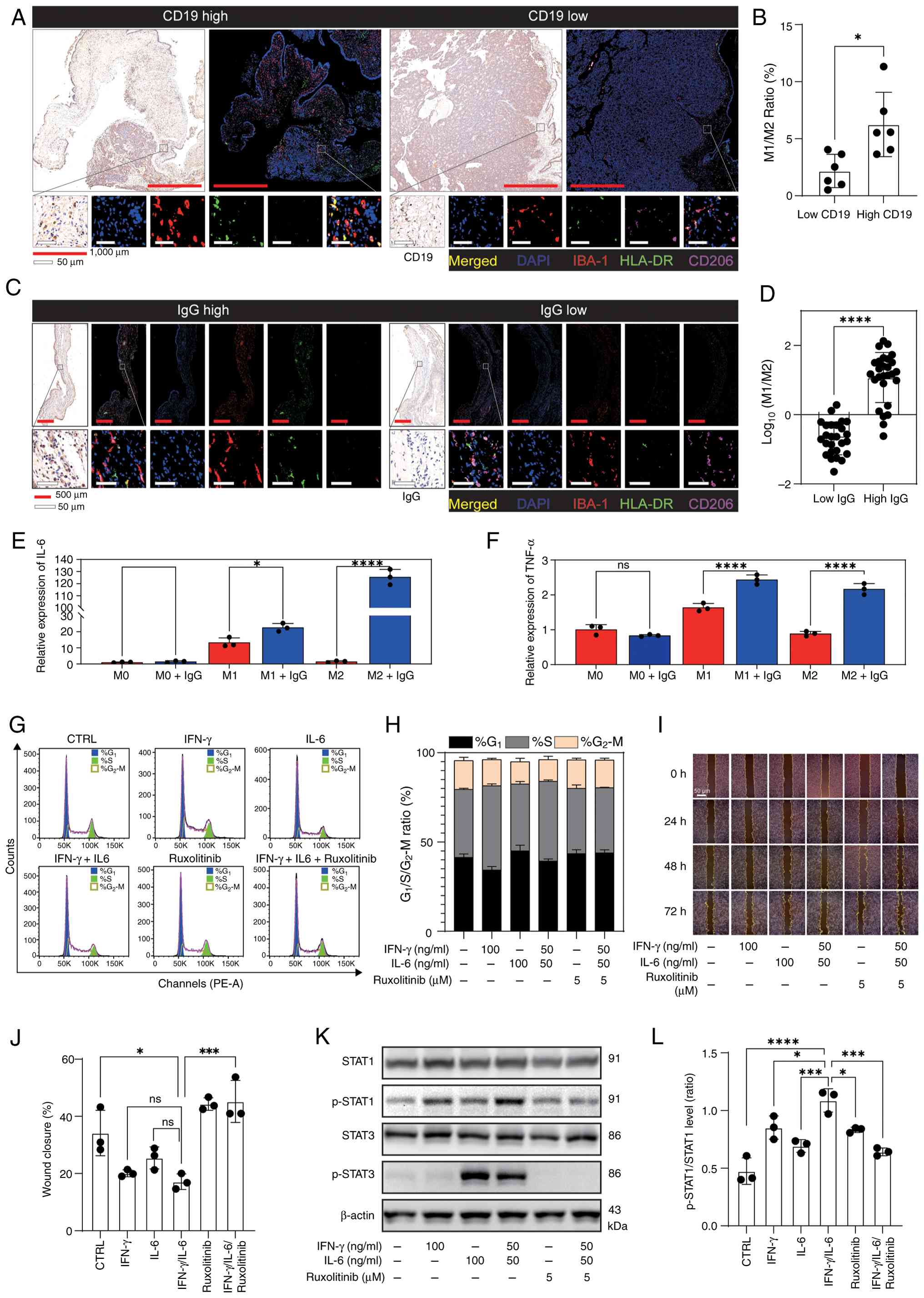 Consistently, multiplex immunofluorescence staining detected higher IL-6 expression in the high-CD19+ group compared with the low-CD19+ group (Fig. S5D and E). Given previous evidence indicating that high concentrations of IL-6 can suppress PA progression (32), dose-response assays (0–100 ng/ml) were performed in TtT/GF cells. Flow cytometry cell cycle analysis indicated IL-6-induced G1-phase arrest (Fig. S5F-J), in contrast to IFN-γ-mediated S-phase arrest (Fig. 4H-I). Combined treatment with IFN-γ (50 ng/ml) and IL-6 (50 ng/ml) altered the cell-cycle phase distribution (Figs. 5G and H, and S5K-M), and reduced migration (scratch wound closure) to a level comparable to the level observed after IFN-γ treatment alone (100 ng/ml) or IL-6 treatment alone (100 ng/ml) (Fig. 5I and J). Western blotting indicated enhanced phosphorylation of STAT1 (phosphorylated-STAT1/STAT1 ratio), whereas STAT3 phosphorylation was attenuated relative to IL-6 monotherapy. This effect was abrogated by the JAK inhibitor ruxolitinib (5 µM) (Figs. 5K and L, and S5N). Taken together, these data support a model in which elevated mucosal IgG levels reprogram macrophages toward an M1-dominant phenotype and, together with IFN-γ, cooperatively amplify JAK-STAT1 signaling to constrain PA cell proliferation and migration.