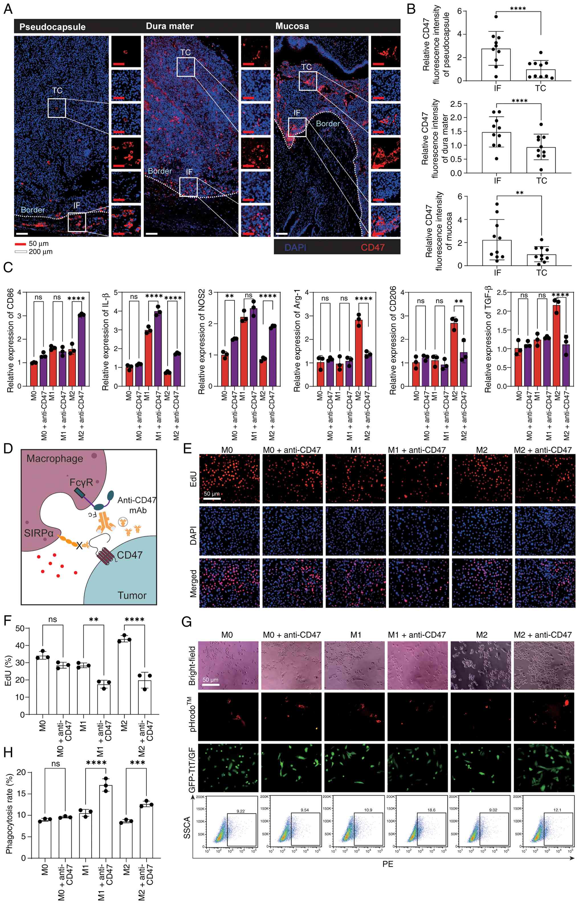 To evaluate the therapeutic potential, M1- and M2-polarized macrophages were exposed to anti-CD47 mAb (10 µg/ml) for 12 h. Anti-CD47 mAb treatment elicited transcriptional changes in M2 macrophages, marked by increased CD86, IL-1β and NOS2 expression together with reduced Arg-1, CD206 and TGF-β levels (Fig. 6C). By comparison, anti-CD47 mAb treatment induced only modest effects in M0 (NOS2 upregulation) and M1 macrophages (IL-1β upregulation) (Fig. 6C). Previous studies have demonstrated that anti-CD47 mAb augments macrophage phagocytosis and immune activation (35,36) (Fig. 6D). In macrophage-TtT/GF co-culture assays, anti-CD47 mAb treatment did not significantly affect tumor cell proliferation or phagocytic activity in the presence of M0 macrophages (Fig. 6F and H). By contrast, anti-CD47 mAb treatment in M1- and M2-polarized macrophages significantly reduced tumor cell proliferation, as determined by EdU incorporation, and significantly increased ADCP compared with isotype controls (Fig. 6F and H).