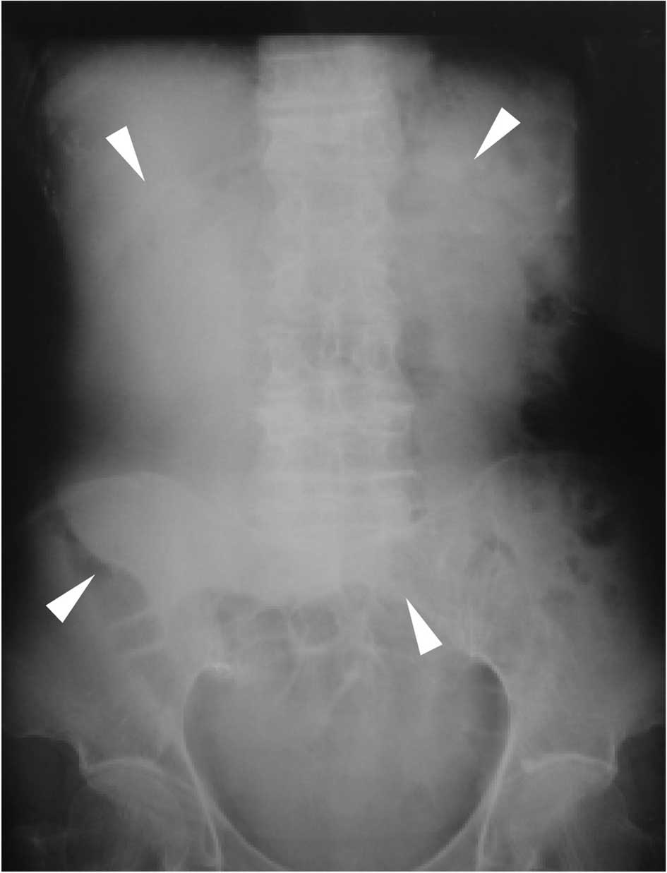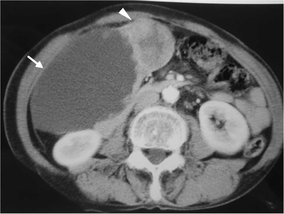A 79-year-old Japanese female suffering from upper abdominal pain and distention was admitted to our hospital. The patient had previous illness of note nor a family history of disease. A large mass was palpable in the right upper quadrant of the abdomen. The patient’s lactate dehydrogenase was elevated to 413 IU/l (normal range <230), and two serum tumor markers, carcinoembryonic antigen (CEA) and carbohydrate antigen 19-9 (CA19-9), were both elevated at 3.4 ng/ml (normal range <2.5) and 1465.3 U/ml (normal range <37), respectively. Abdominal radiography showed an oval radio-opaque shape of 15 cm in diameter in the right upper abdomen (Fig. 1). Ultrasonography (Fig. 2) and computed tomography (CT) (Fig. 3) revealed the tumor to be a monolocular cyst with an irregular wall thickness of 15 cm in diameter concomitant with a solid mass of 8 cm in diameter around the gallbladder bed, suspected to be a tumor originating from the gallbladder. Endoscopic examinations of the alimentary tract showed no abnormalities. During celiotomy, the tumor with a large pale gray cystic component was identified at the fundus of the gallbladder. The tumor fibrously adhered to the liver, duodenum, and greater omentum, but it appeared to have only partially infiltrated into the transverse colon. A number of small nodules suspected to be tumor dissemination were scattered on the peritoneum. Gallbladder cancer with peritoneal dissemination was diagnosed. Although curative resection for the tumor was impossible, a simple cholecystectomy was performed that included the tumor without systematic lymphadenectomy, and a partial resection of the transverse colon was added due to its tight adhesion by the tumor cyst.