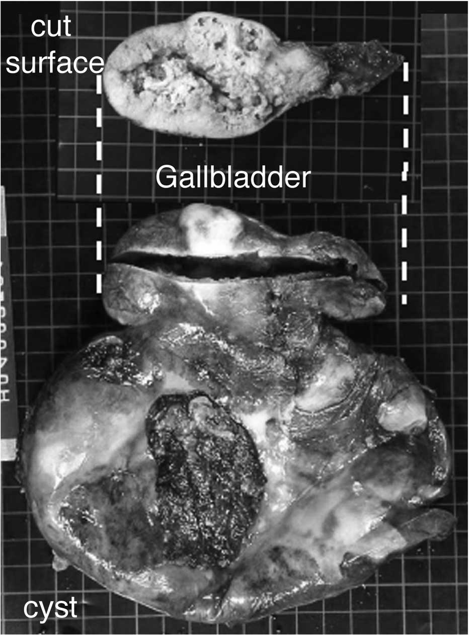 Primary gallbladder carcinoma shows a variety of growth patterns, some of which spread expansively to form a mass while others infiltrate diffusely and deeply into the gallbladder wall or the surrounding organs. Numerous studies have been conducted on gallbladder carcinoma with cystic formation, such as cystadenocarcinoma of the gallbladder (1–4) and Rokitansky-Aschoff sinus (RAS)-associated gallbladder carcinoma (5–7). In these tumors, it is normal that the cancerous cystic component is multilocular or not large in size. This study evaluated the clinicopathological findings and analyzed the morphogenesis of a gallbladder carcinoma showing a large malignant cystic growth.