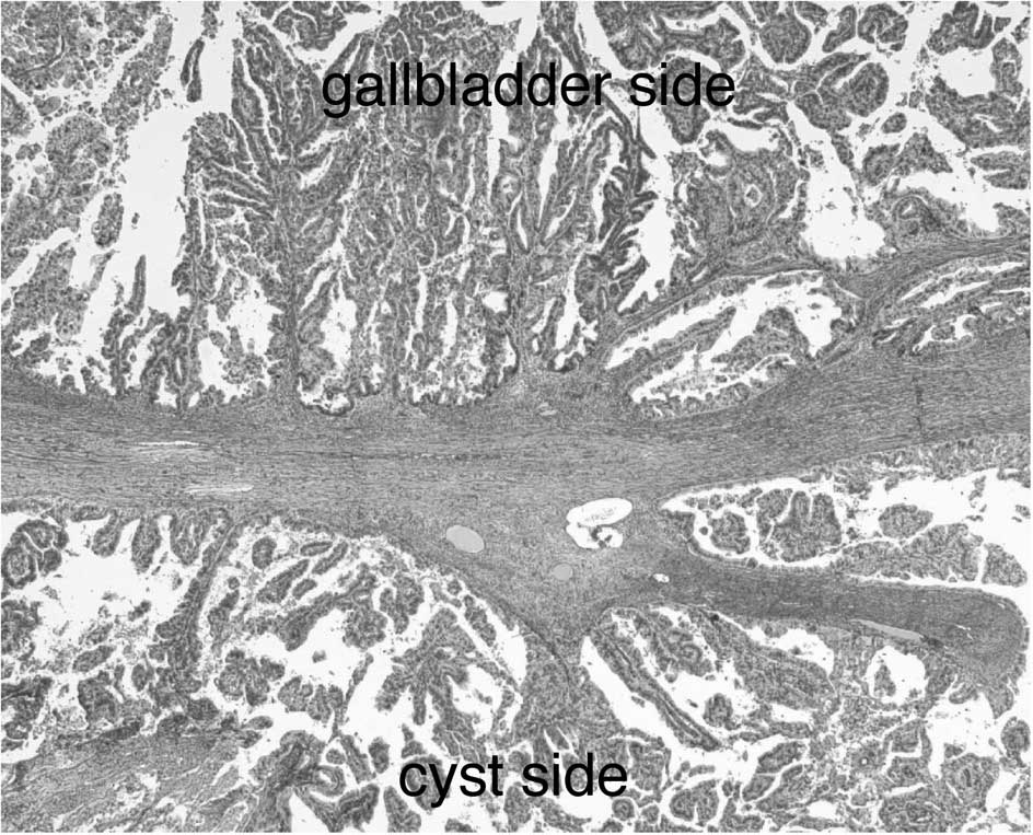 In conclusion, this study reports a rare case of gallbladder carcinoma with a large monolocular cystic carcinoma component. Although the mechanism responsible for the development of cyst-forming papillary carcinoma of the gallbladder remains unknown, the present case is crucial for understanding the mechanism of cystogenesis in gallbladder carcinoma. We anticipate that as additional case reports accumulate, it is likely that the nature of cyst-forming papillary carcinoma may be proven and the entity established as a unique carcinoma.