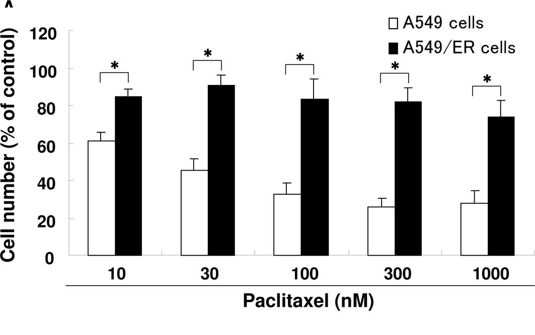 The drug sensitivity of each cell line was tested using a MTT assay. Fig. 2 shows the sensitivity of the parental and resistant cell lines to various anti-cancer agents. Notably, A549/ER cells were resistant to paclitaxel and gemcitabine as compared to A549 cells (Fig. 2A and B).