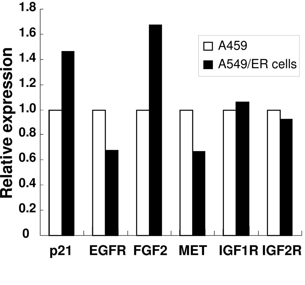 The temporal pattern of gene expression in A549 and A549/ER cells was compared by a PCR array that covered 84 genes. A number of genes including EGFR and MET were down-regulated in A549/ER compared to A549 cells. A total of five genes were up-regulated more than 1.4-fold in A549/ER cells. The genes, including the ones for FGF2 and p21/CDKN1A, were increased in A549/ER compared to A549 cells (Fig. 3A). The expression of insulin-like growth factor-1 receptor (IGF1R) and IGF2R was not altered between A549 and A549/ER cells. To validate the PCR array using independent methods, RT-PCR analysis was performed using specific primers for each gene. Consistent with the array data, FGF2 and p21 expression was increased in A549 cells, while EGFR expression was decreased (Fig. 3B).