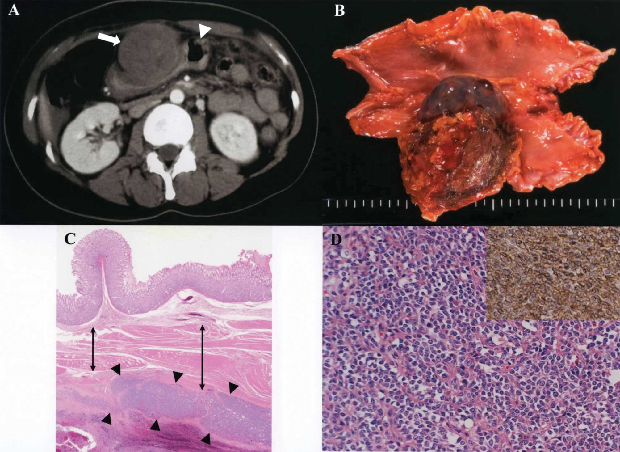 Ewing sarcoma/primitive neuroectodermal tumors (ES/PNETs) are malignant tumors whose cells typically express the CD99 surface antigen encoded by the MIC2 gene (1). ES/PNETs most commonly arise in bone, and occasionally originate in soft tissue (1). However, it is relatively rare for ES/PNETs to arise from the stomach. Only four cases of gastric ES/PNETs have been reported in the English-language literature (PubMed, National Library of Medicine, Bethesda, MD, USA) prior to September 2010 (2–5). In this study, the four cases were assessed and an additional case was reported to further characterize the clinicopathological parameters in gastric ES/PNETs.