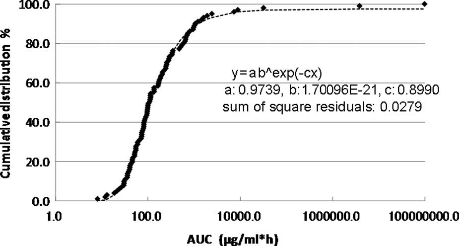 The cumulative distribution of the individual AUCIR50 in the 101 patients is shown in Fig. 2. The cumulative distribution of the individual AUCIR50 was regressed over the sigmoid curve (logarithmic scale). The approximate expression was almost exactly y=ab^exp(−cx) (a=0.9739, b=1.7096E-21, c=0.8990 and the sum of square residuals, 0.0279).