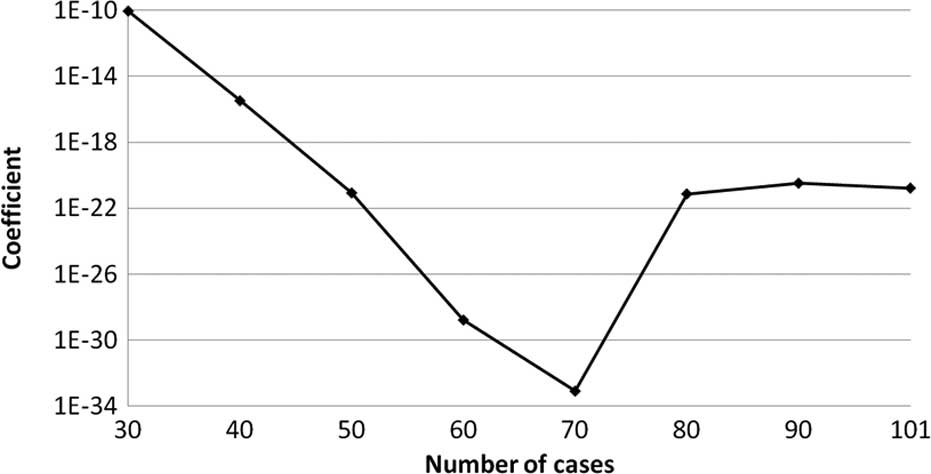 The transition of the coefficients (a, b and c) and the sum of the square residuals in the approximate expression [y=ab^exp(−cx)] with an increase in the number of patients are shown in Figs. 4, 5, 6 and 7, respectively. In the 80 cases examined, no notable change was observed in the regression curve with an increase in the number of patients.